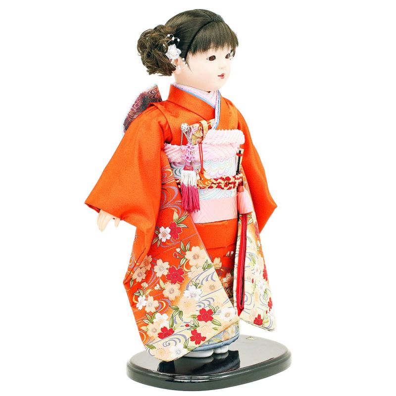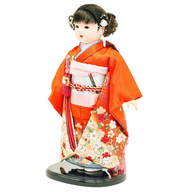 市松人形 齊藤公司作 13号 朱色 桜柄 ケース入り 横幅42cm