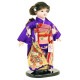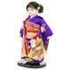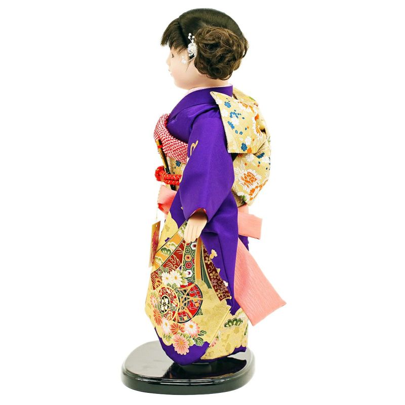 艶やかな紫地に豪華な花柄があしらわれた、上質衣装をまとった市松人形です。