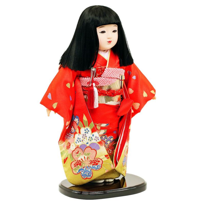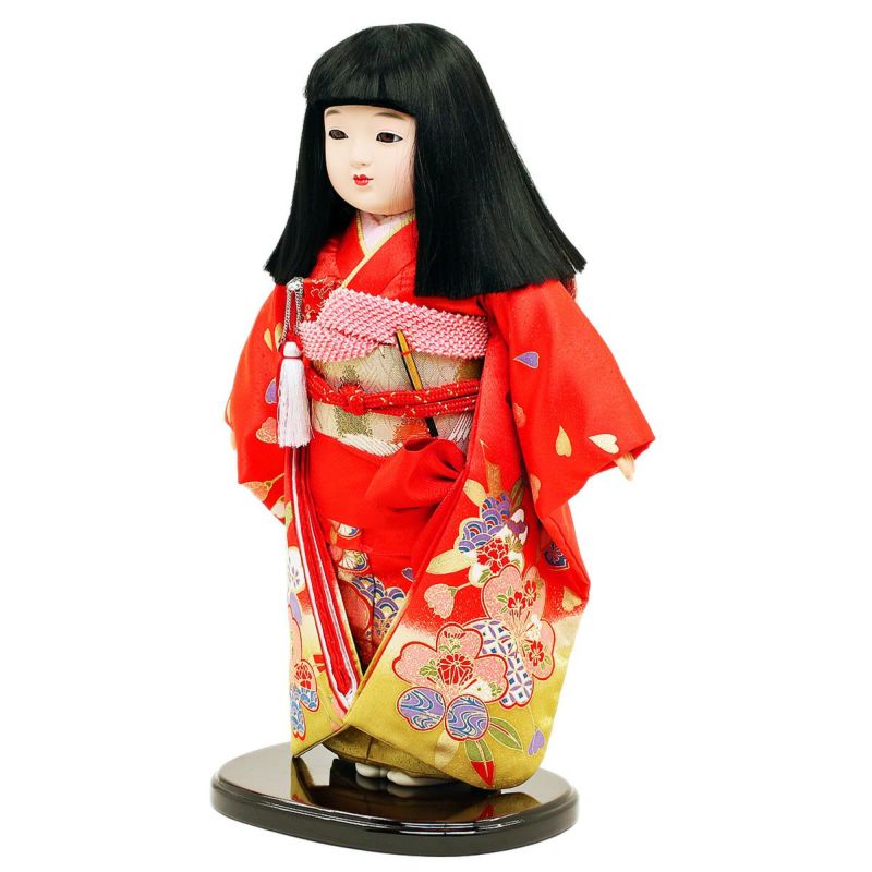 艶やかな赤地に豪華な花柄があしらわれた、上質衣装をまとった市松人形です。