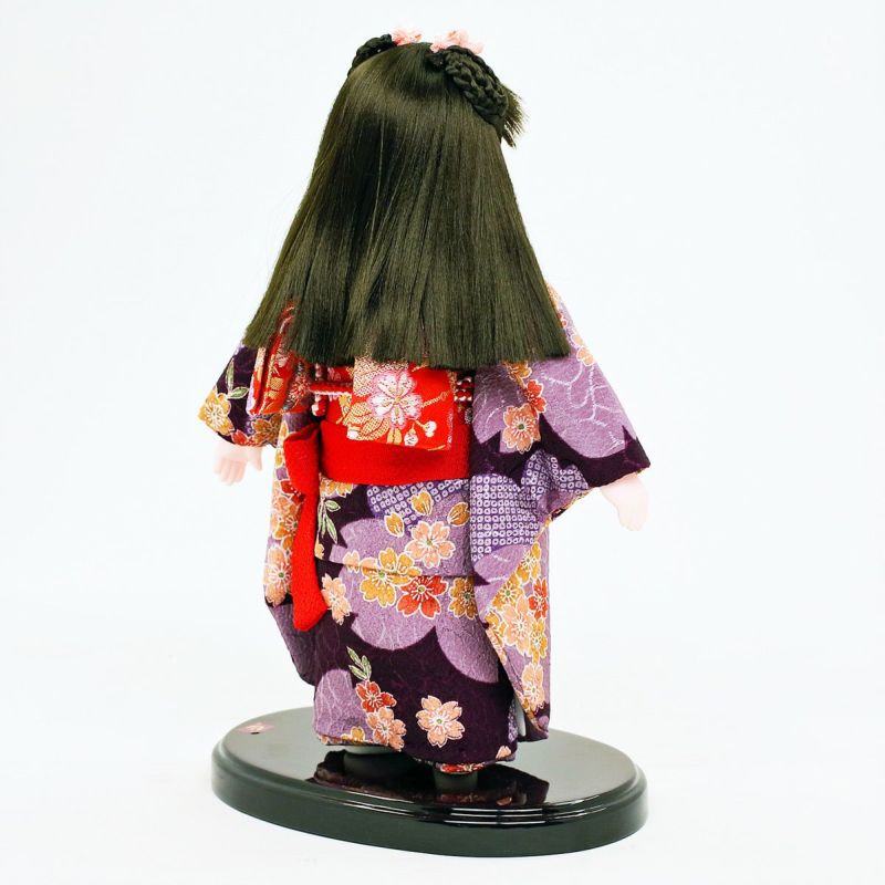気品ある紫色地に桜柄の、上質衣装をまとった市松人形です。