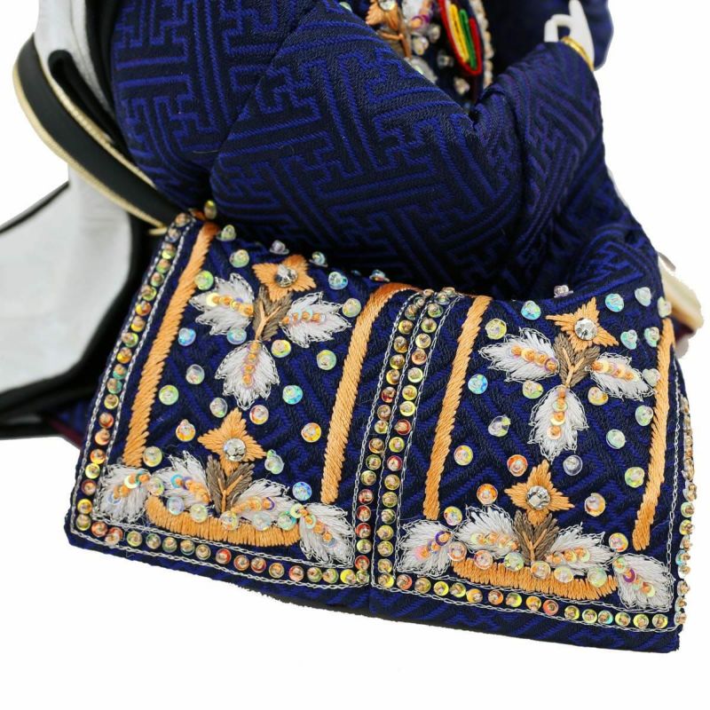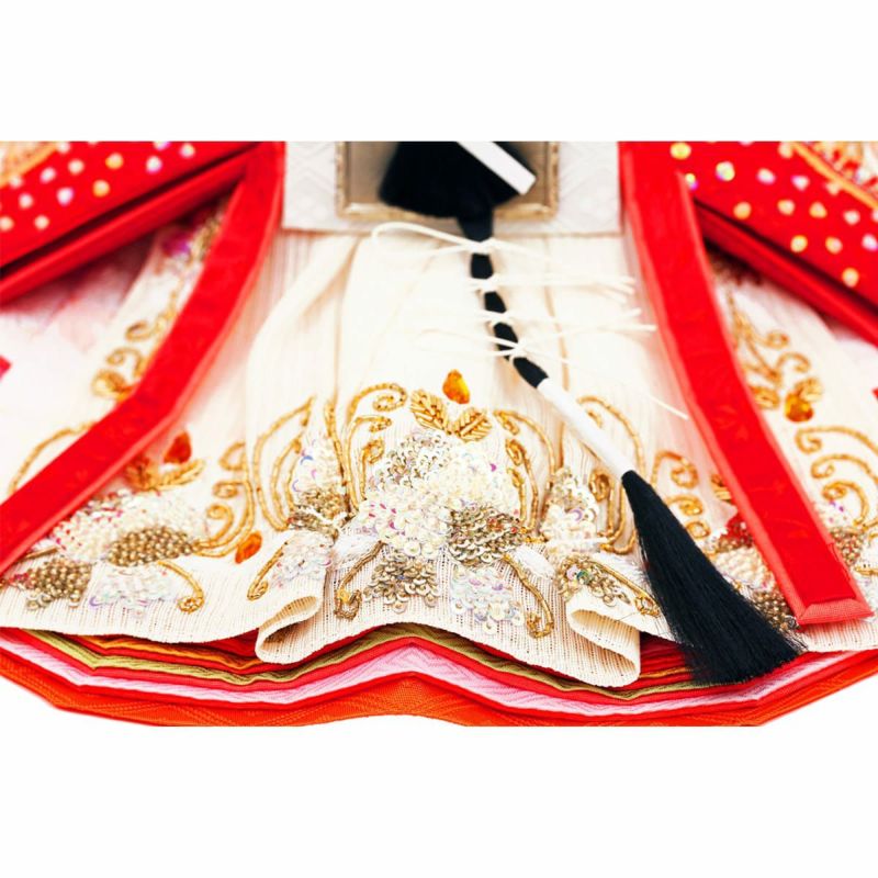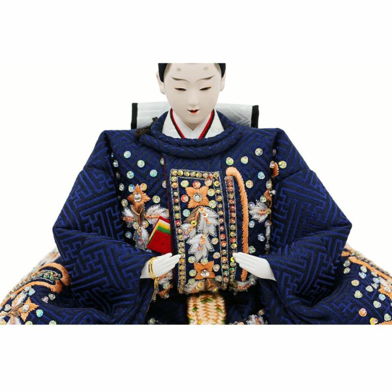 シンプルな金屏風に、ラインストーンとスパンコールを用いて刺繍仕上げをほどこした衣装のお雛様です。