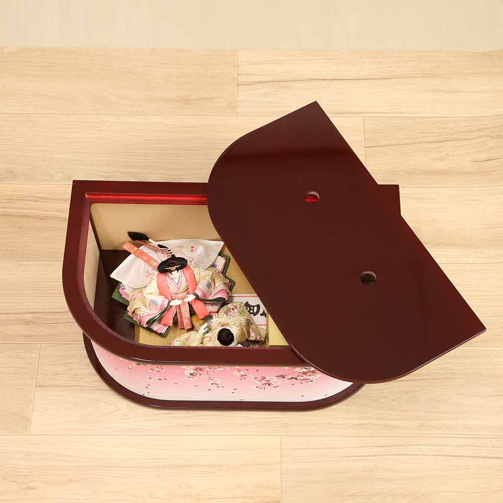 お雛様やお道具類などの飾りもの全てが箱に収まる、便利な収納タイプのひな人形飾りです。