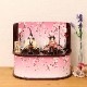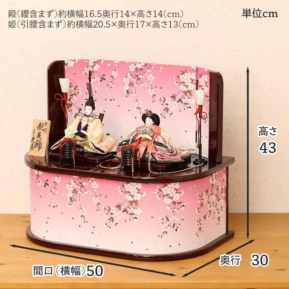 桜柄が描かれた台屏風セットに、桜柄刺繍の衣装を身にまとった、お雛様です。