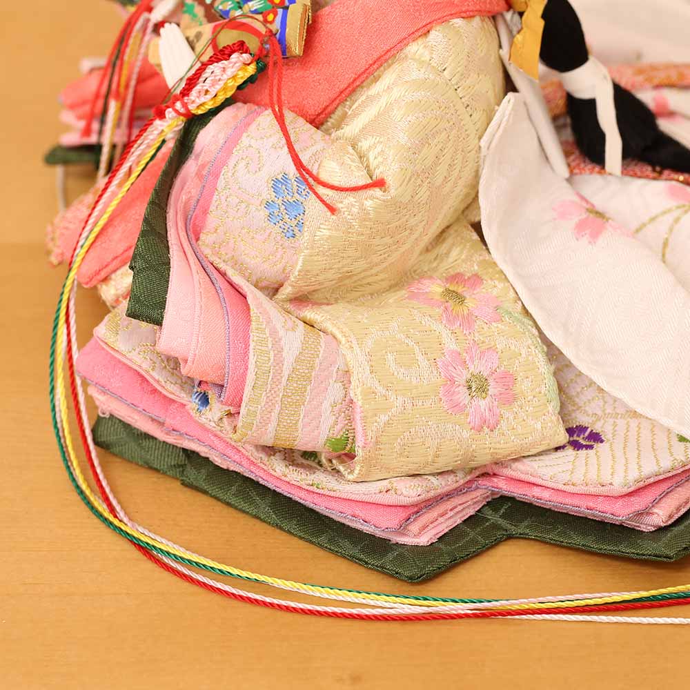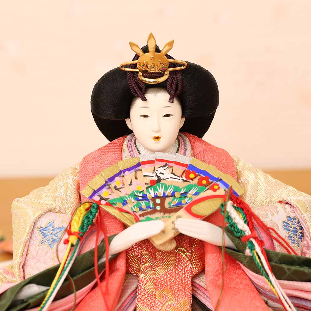 きっちりと着せ付けられた衣装着ひな人形というのは、生地の高級感が映え、ひと手間ひと手間、着せ付けていく職人の技が輝ります。