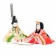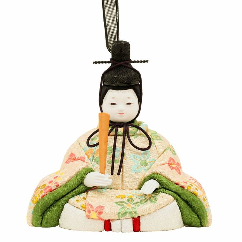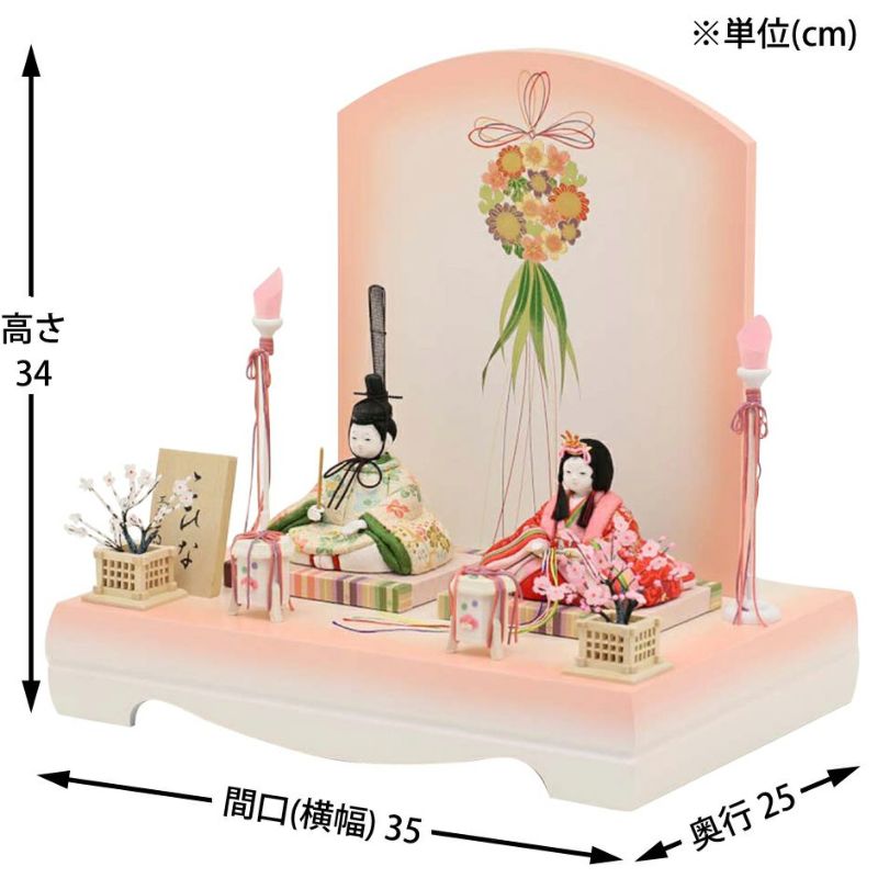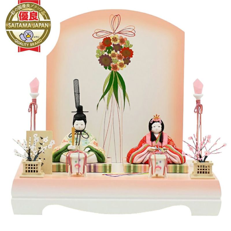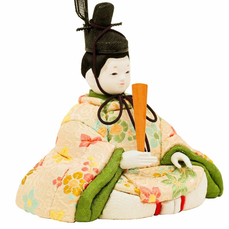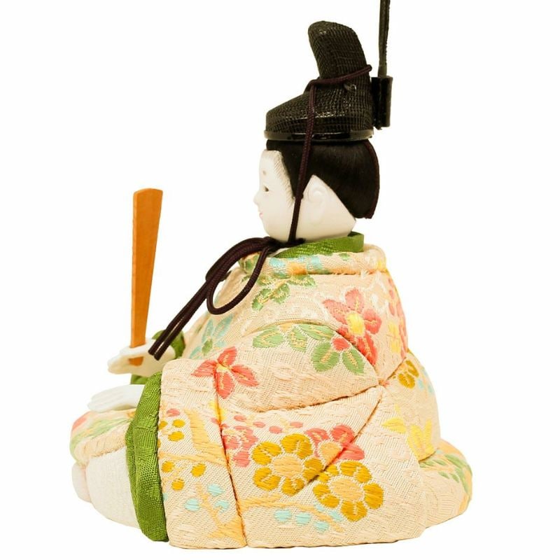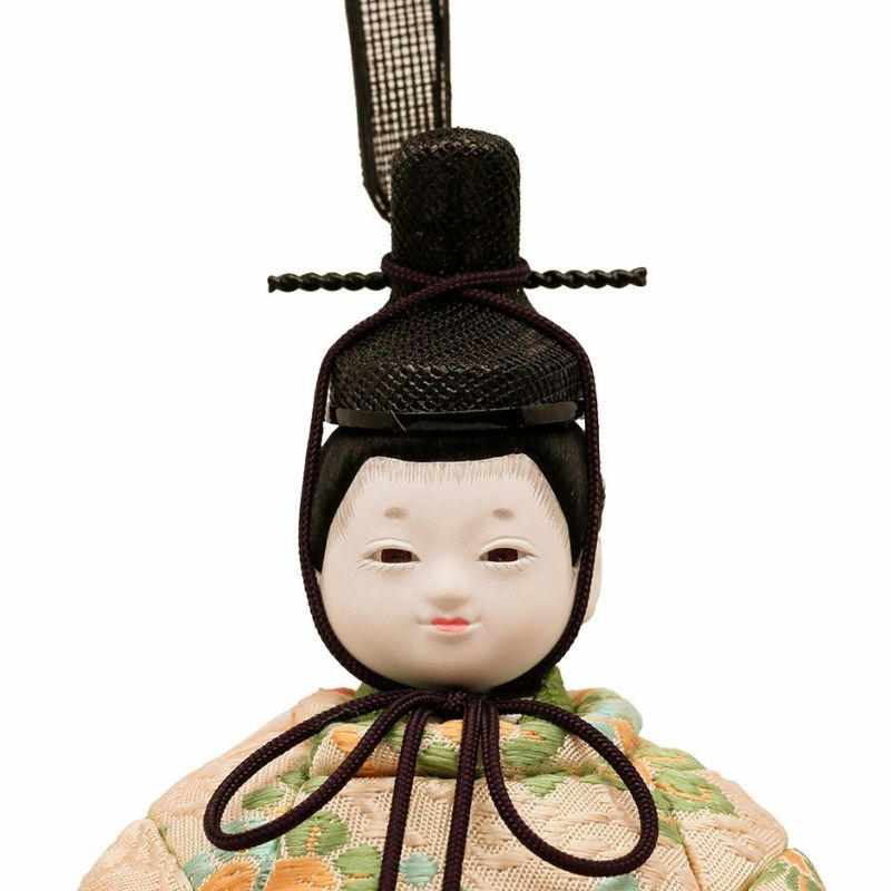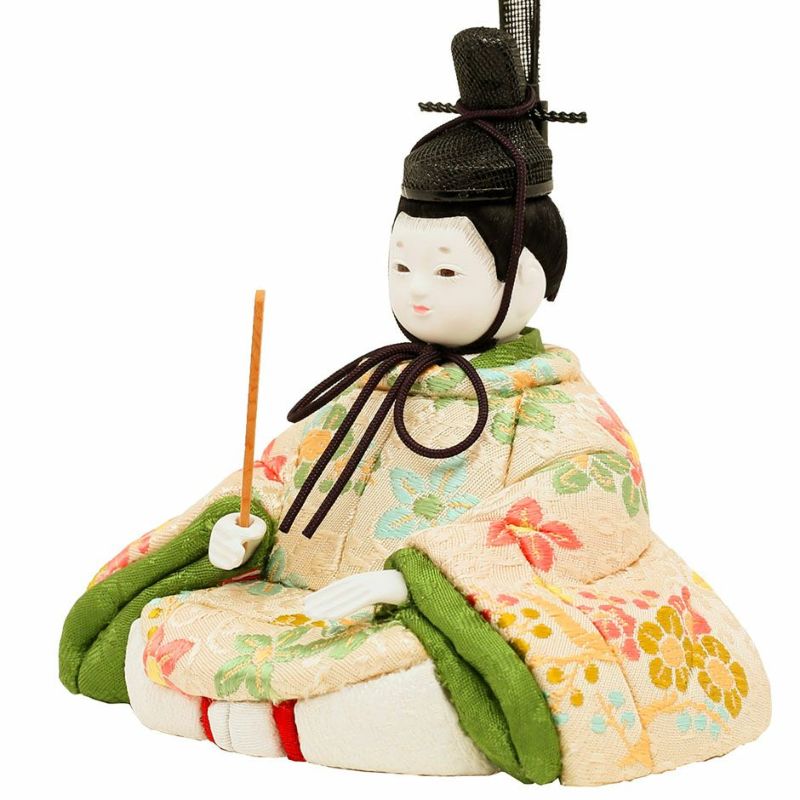 お子様のご誕生の慶びを花の久寿玉で表現した、縁起の良さが感じられるコンパクトサイズの親王飾りひな人形。 こちらの江戸木目込み人形は、正絹・京都西陣織物を用いた、上質衣装の親王飾り(二人雛)です。 男雛:淡い色合いに小花柄が古典的に織り出された京都西陣織物の衣装です。 屏風に高さを出して見栄え感を演出したセットです。 人形工房天祥オリジナル 間口(横幅)35×奥行25×高さ34(cm)上質衣装の親王飾り(二人雛)