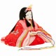 殿には落ち着いた色合い、姫には赤地に花柄が織り出された、上品な衣装のお雛様です。