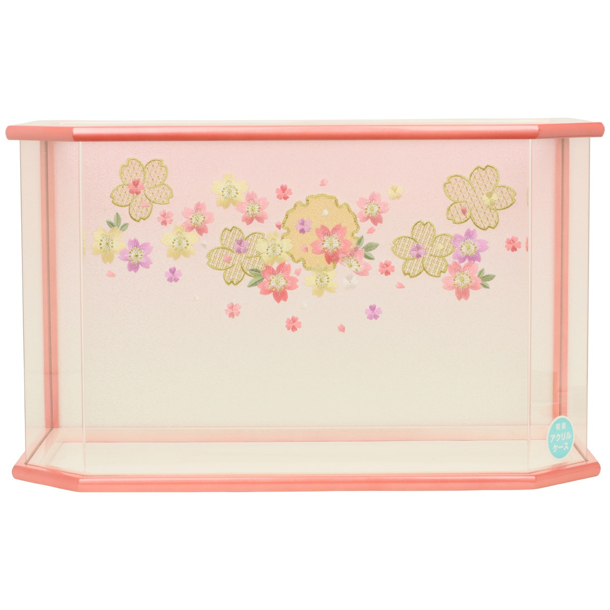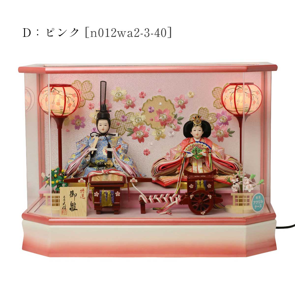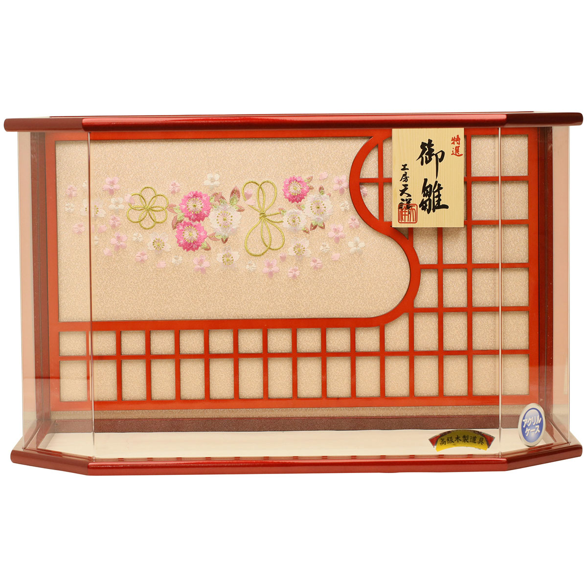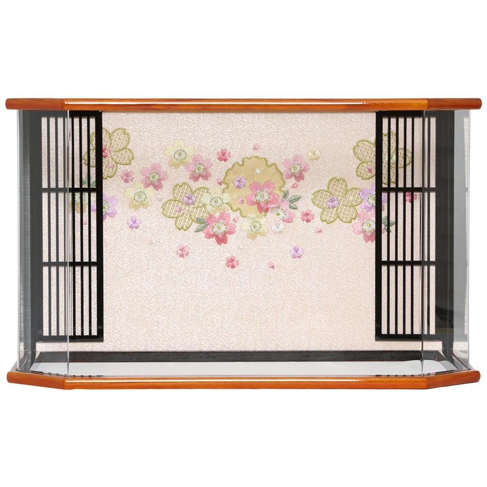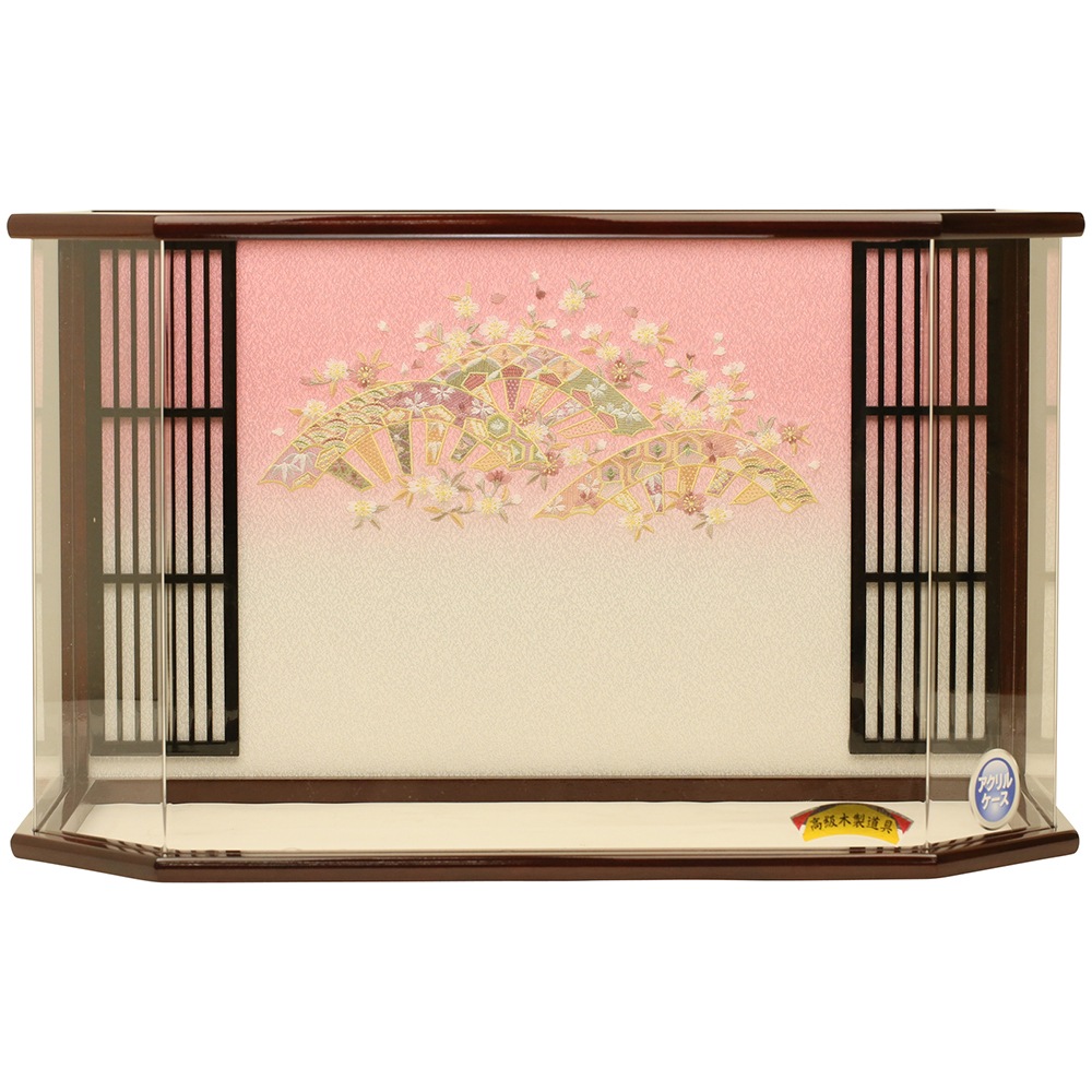 御殿を思わせるような格子付きデザインのケースに、豪華な金彩加工がほどこされた衣装、十二単のお雛様を合わせています。 “扇に桜”柄が刺繍されたケースに、色柄ともに春を感じさせる衣装、十二単のお雛様を合わせました。 お顔のお化粧も特殊な技法をつかって描いた、高級仕様のぷり姫シリーズのお顔のお雛さま。 枠ナシ六角型のケースは見栄えの良いデザイン性だけでなく、 軽くて割れにくいアクリル製のケース飾りで、場所をとらずにコンパクトで飾りやすさが好評です。 組み立て不要。出し入れ簡単、お掃除も簡単!気軽に飾れます。 京都西陣金襴織物 京都西陣金襴織物 アクリルケース 電気コードをつなげると、実際に灯りがつきます。【A:黒/赤 [712kt-case3] 】