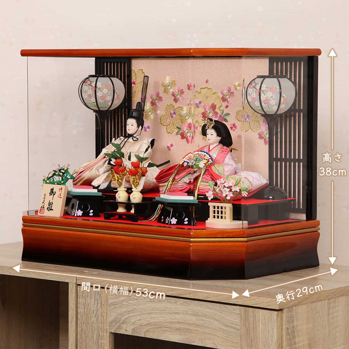 お祝い事にも相応しい華やかさと全体の可愛らしい雰囲気が女の子のハートをとらえる、 親王飾りケース入りは、出し入れ簡単で扱いやすく飾るテマがないという点もお薦めポイントのひとつです。