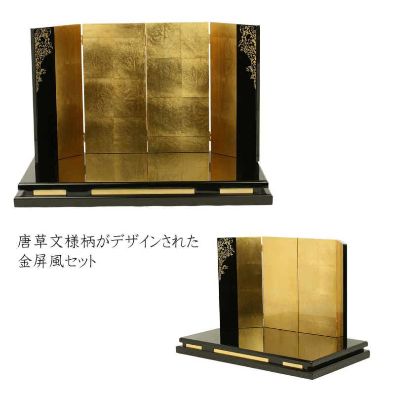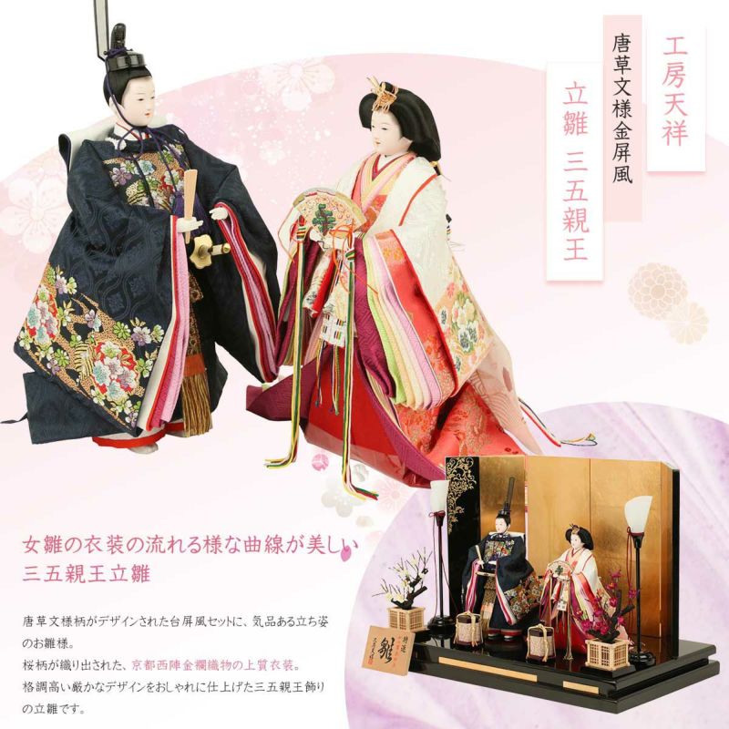 こちらの「三五親王飾り 立雛」は、唐草文様柄がデザインされた金屏風セットに、 気品ある立ち姿のお雛様です。