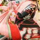 正絹帯から仕立てたお衣裳は、黒地に色鮮やかな花柄を織り出し、華やかさを感じさます。