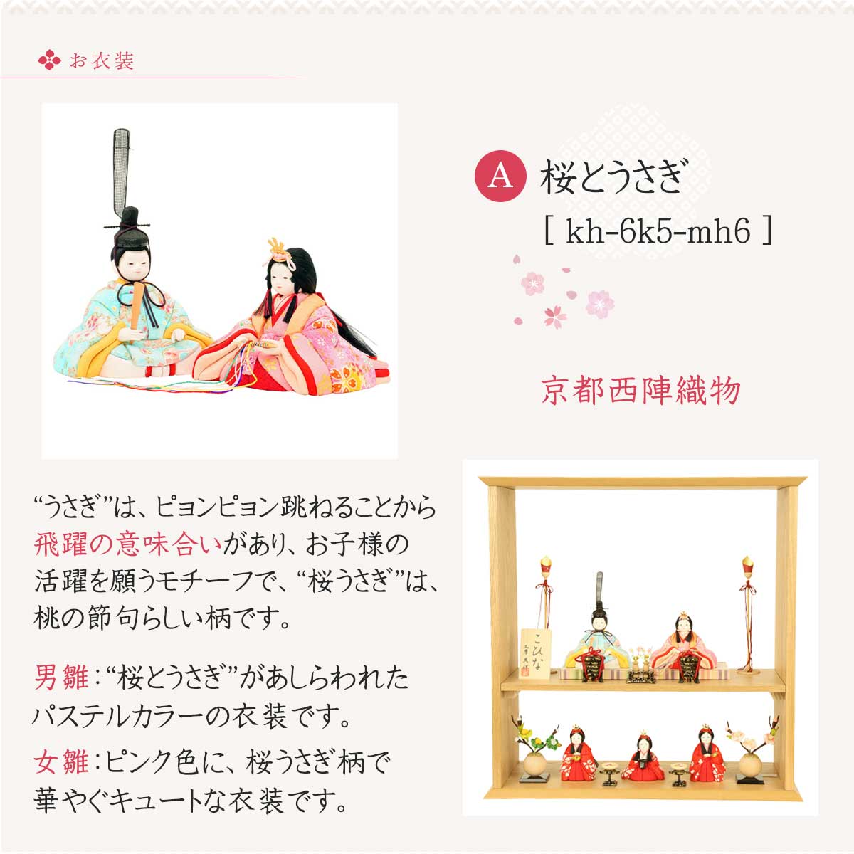 女雛:ピンク色に、桜うさぎ柄で華やぐキュートな衣装です。