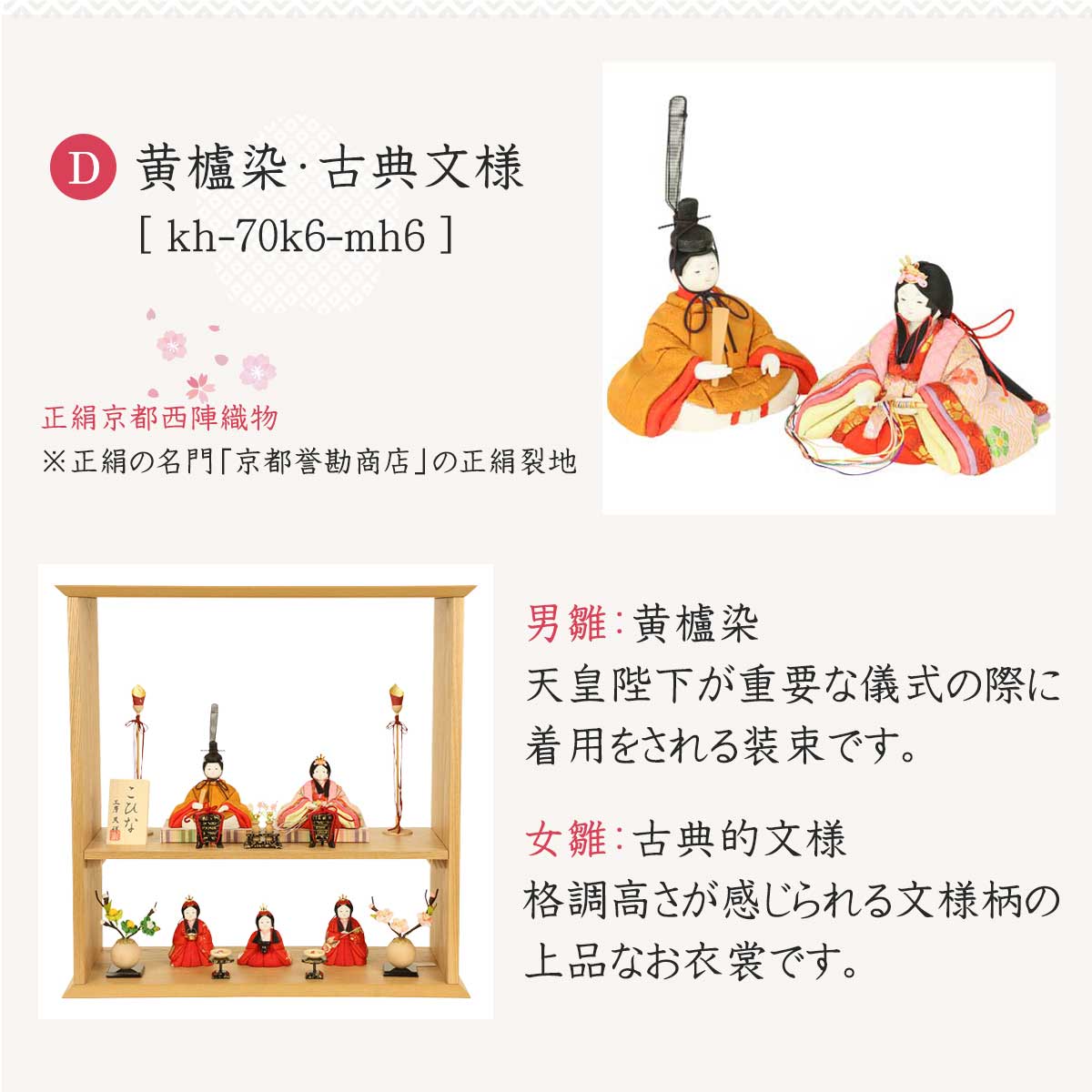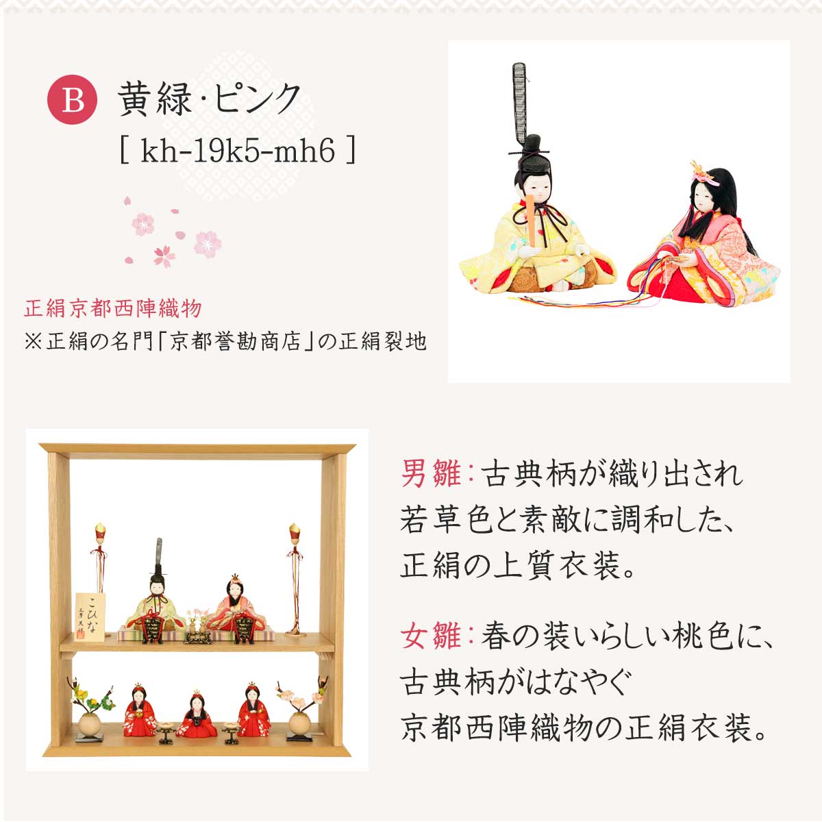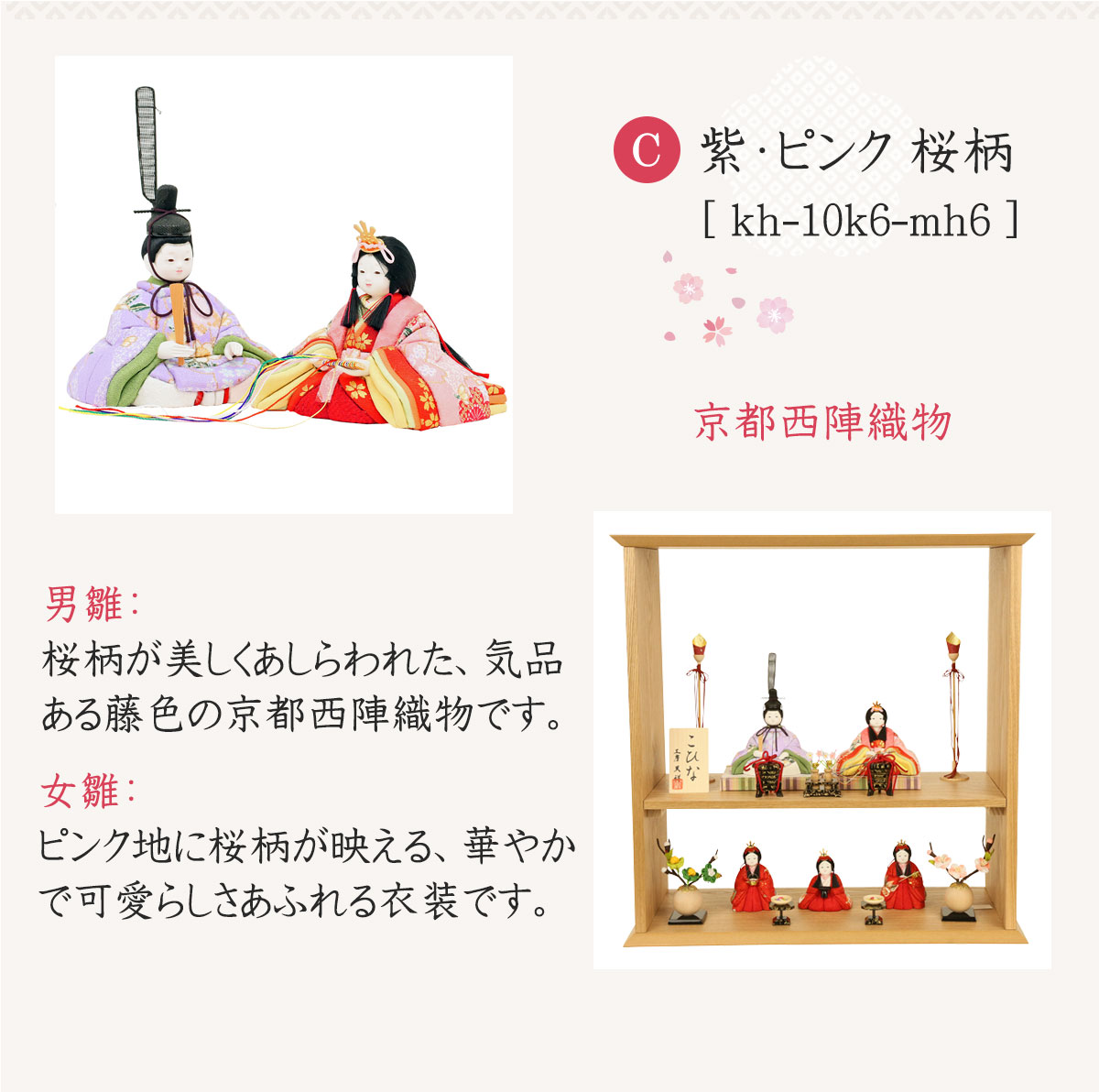 女雛:ピンク地に桜柄が映える、華やかで可愛らしさあふれる衣装です。