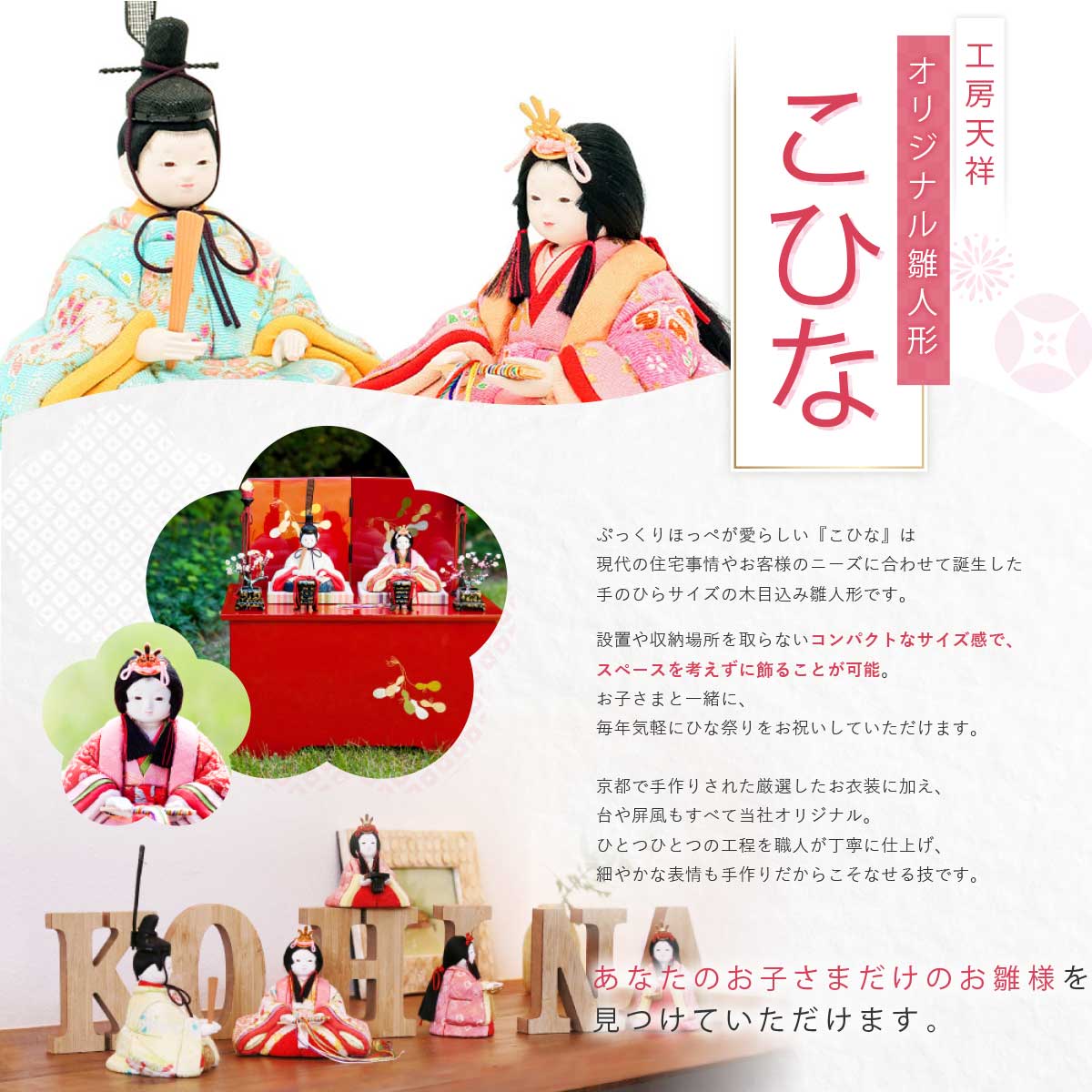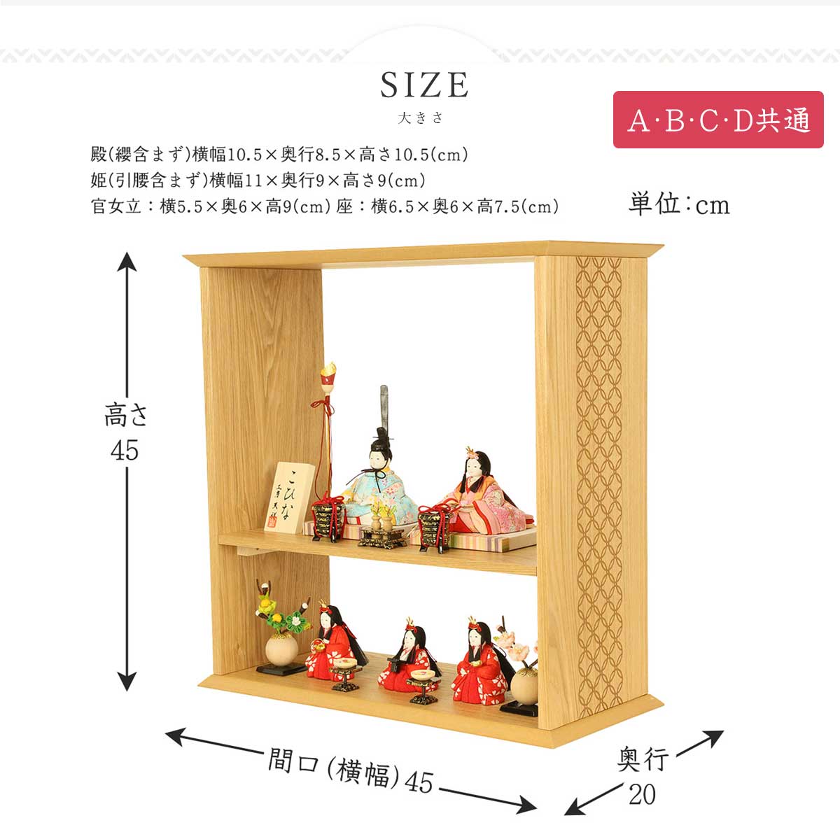 木目込み雛人形「こひな」は、工房天祥オリジナルの、小さな小さなお雛様です。 【お衣裳】 【お衣裳】 【お衣装】 【お衣装】 間口(横幅)45×奥行20×高さ45(cm)
