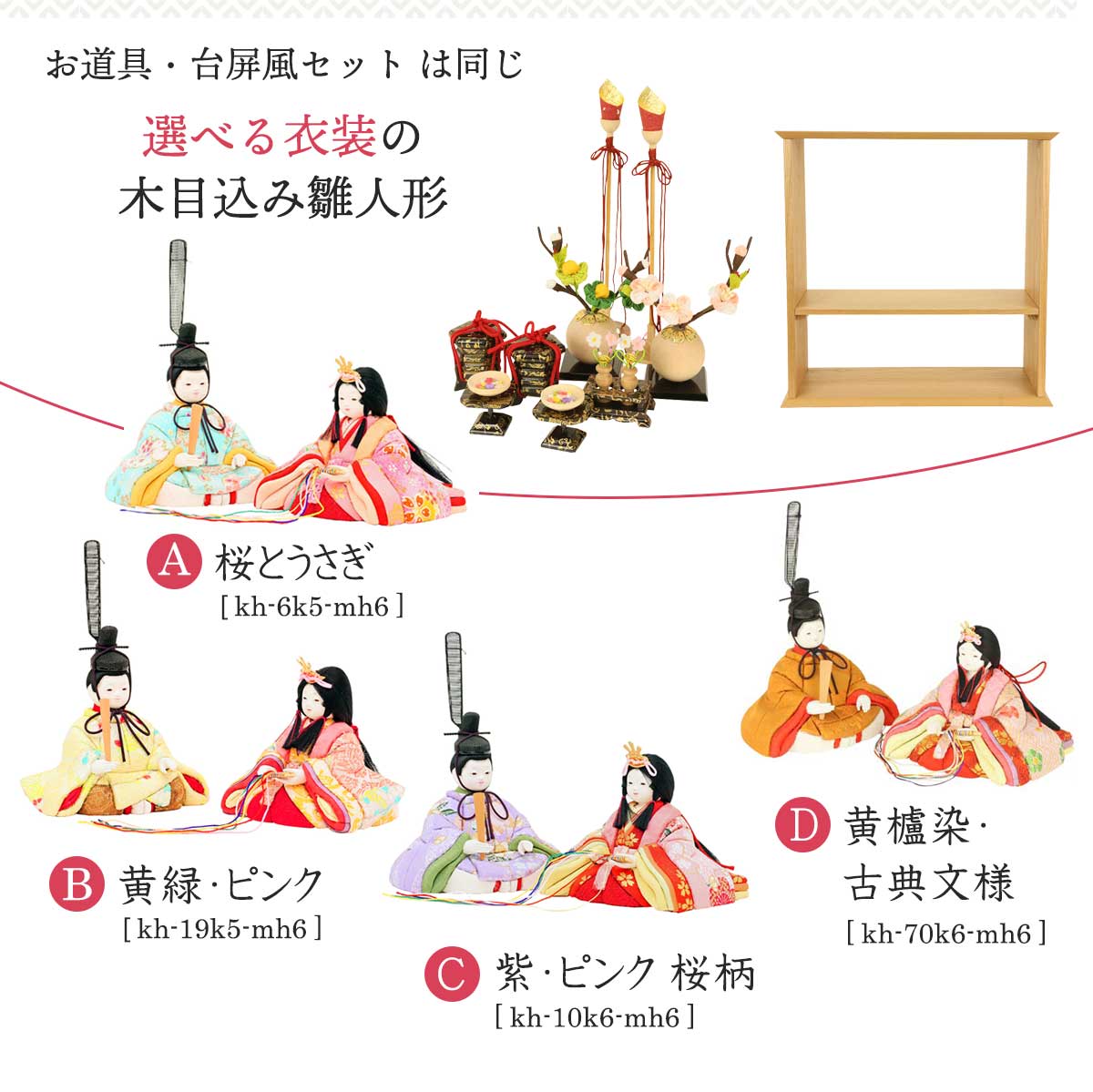 そして、シンプルなのに温かみのあるコンパクトな木製台屏風セットは、天板とサイドに吉祥柄の“七宝”柄が描かれた、お祝い事らしいデザインです。[A] kh-6k5-mh6:桜とうさぎ