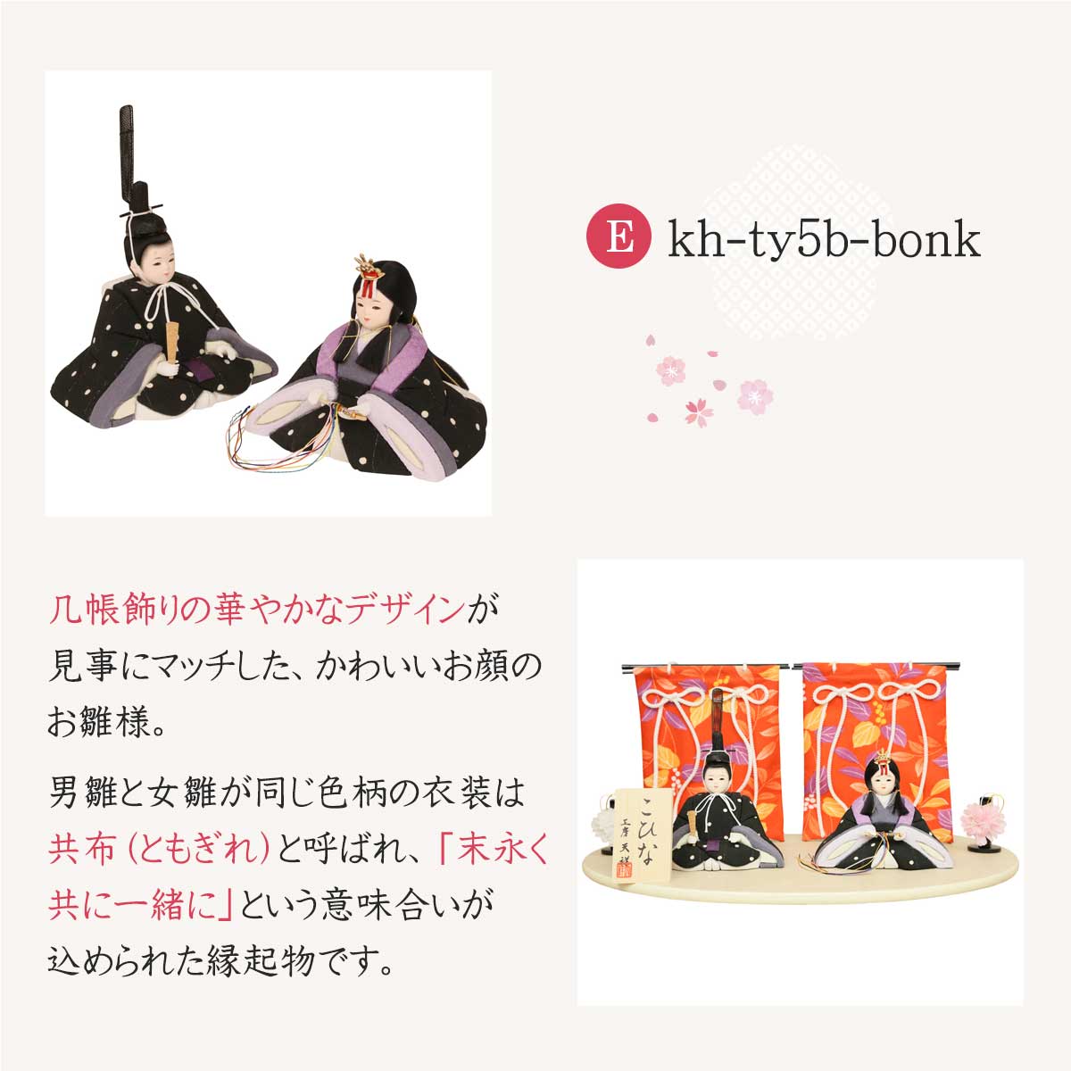 また、男雛と女雛が同じ柄でおしゃれなお衣裳は、共柄(ともがら)と呼ばれ、「末永く共に一緒に」という意味合いが込められた縁起物のお着物です。[C] kh-ty1b-bonk