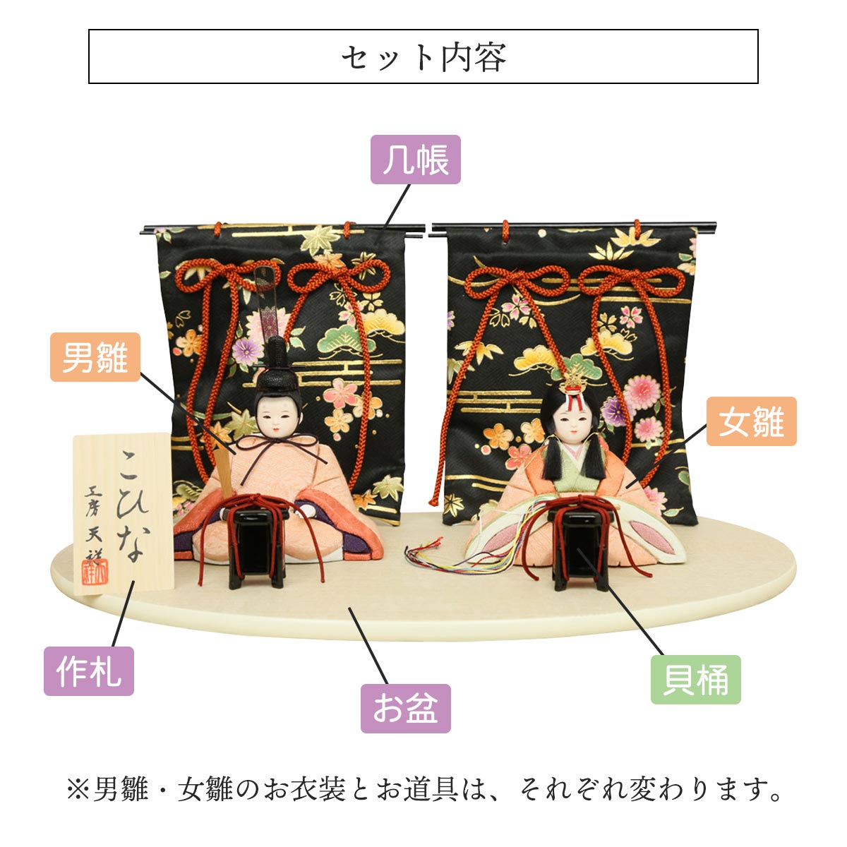 木目込み雛人形「こひな」は、工房天祥オリジナルの、小さな小さなお雛様です。 黒色の几帳飾りによって艶やかな雰囲気に仕上げている、かわいいお顔のお雛様。 華やかなデザインの几帳によって、より可愛らしく魅せる、丸いお顔のお雛様。 高嶺の花との意味合いを持つシャクナゲと、“子孫繁栄”縁起が良いとされる唐草紋様柄が織り出された、京都西陣織物の衣装のお雛様を、 お衣裳は黒白の水玉柄で、お盆飾りセットに合わせた木目込み雛人形の親王飾りです。 几帳飾りの華やかなデザインが見事にマッチした、かわいいお顔のお雛様。 お衣裳は白黒の水玉柄で、うさぎ柄の几帳飾りセットに合わせたコンパクトな木目込み雛人形の親王飾りです。 粋なデザインの几帳によって、よりおしゃれに魅せる、丸いお顔のお雛様。 几帳飾りの華やかなデザインがお着物見栄えを引き立てる、かわいいお顔のお雛様。 間口(横幅)40×奥行27×高さ19(cm)