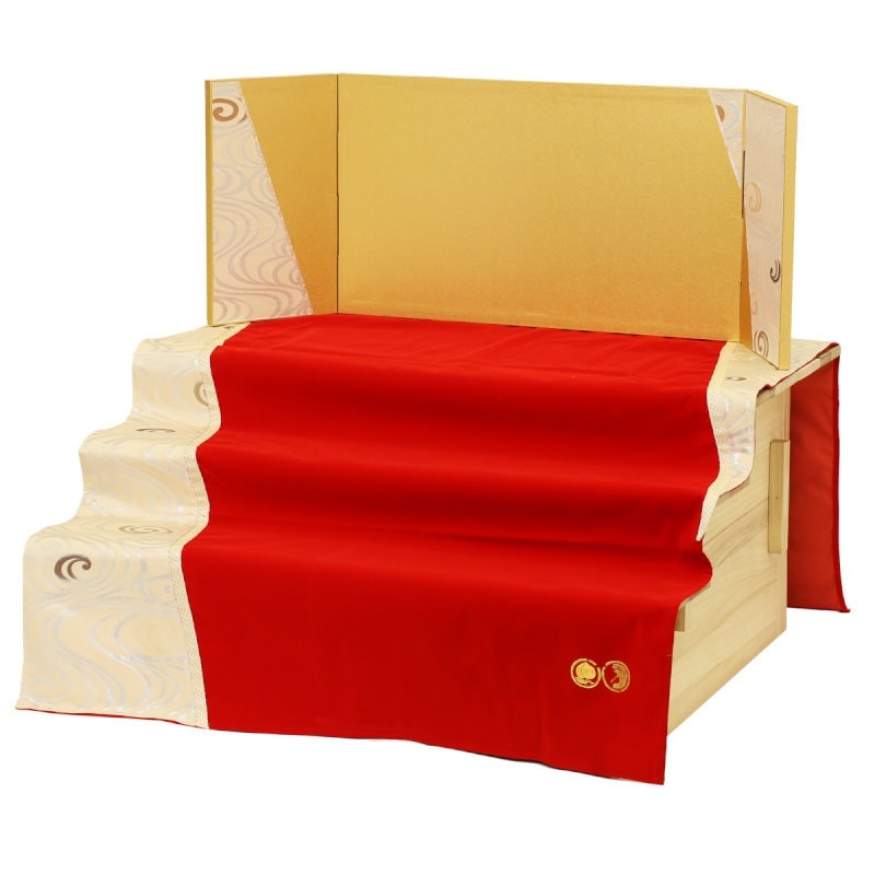 桐製の段飾りに、白と銀色を基調とした毛氈風・段掛けスタイルの三段飾りです。