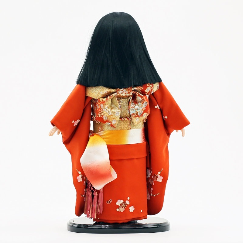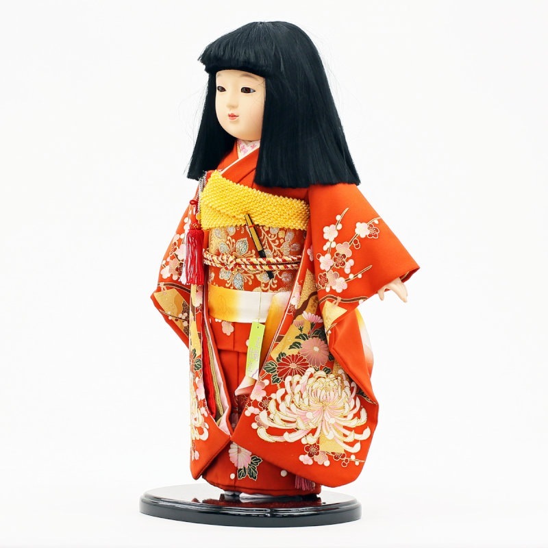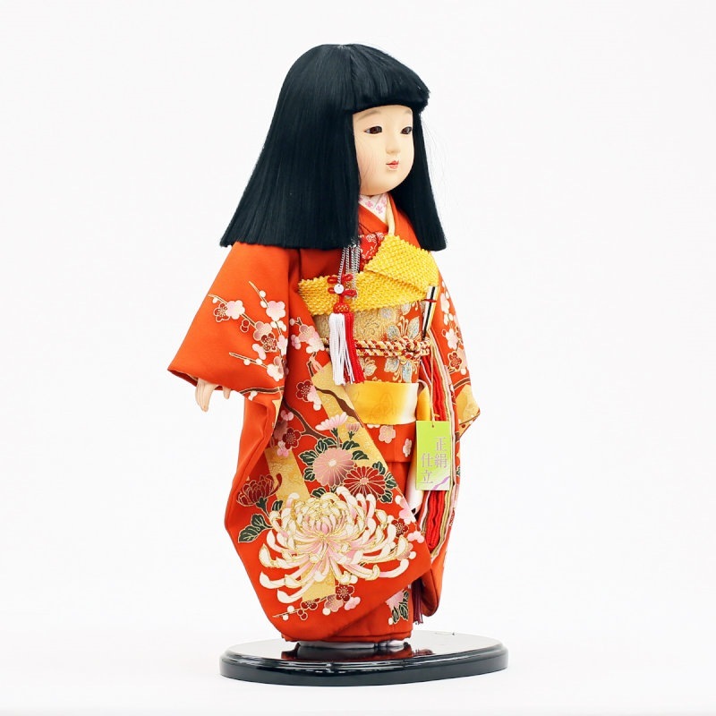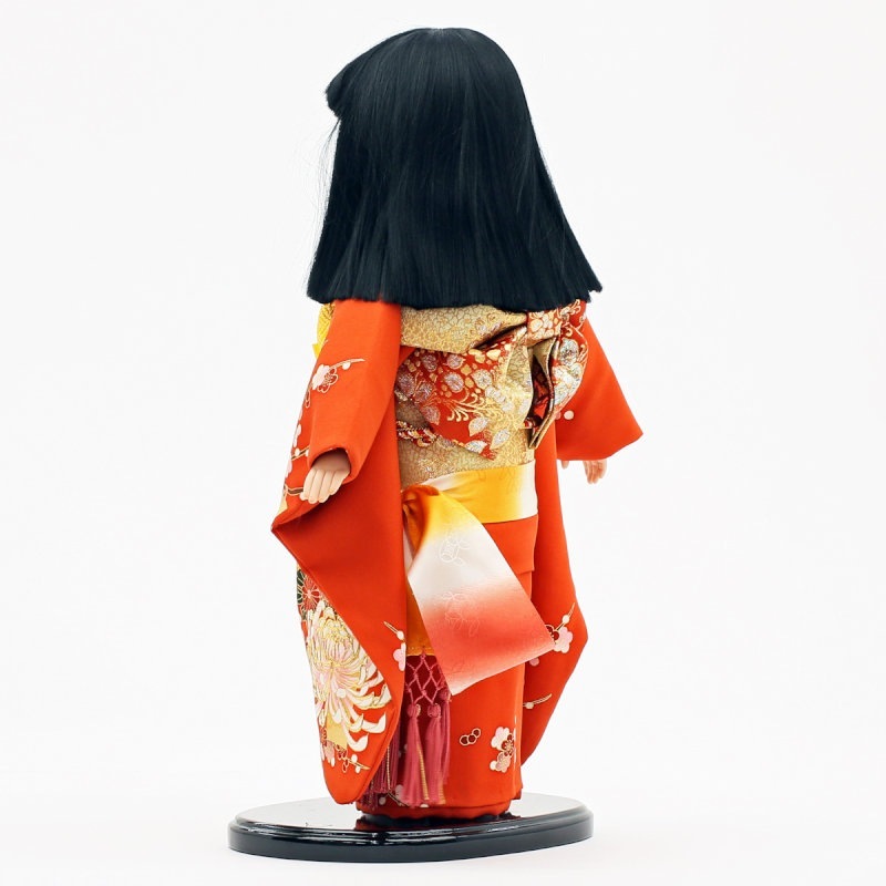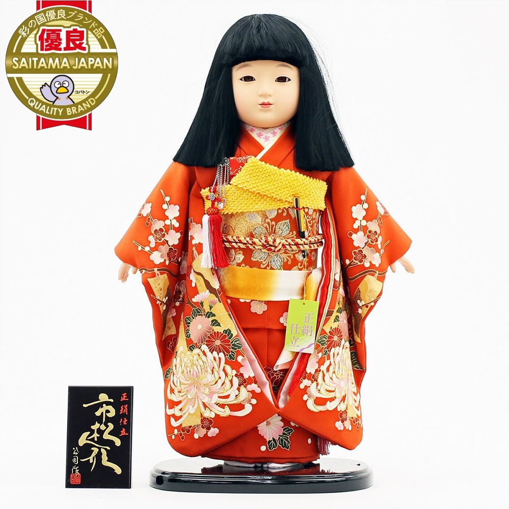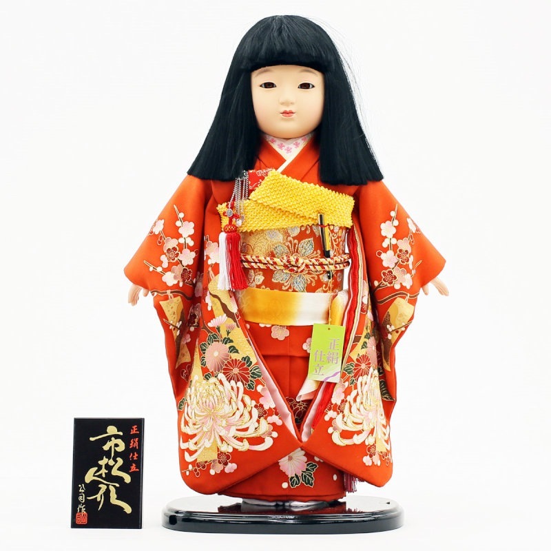 赤地に“菊”柄が大胆にあしらわれた、正絹の上質衣装をまとった市松人形です。
