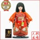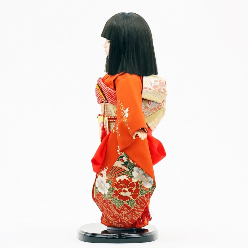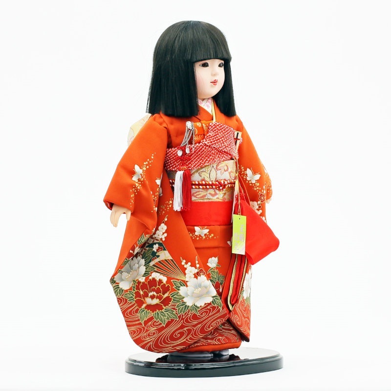 赤地に“流水に牡丹と蝶”柄が優美にあしらわれた、正絹の上質衣装をまとった市松人形です。