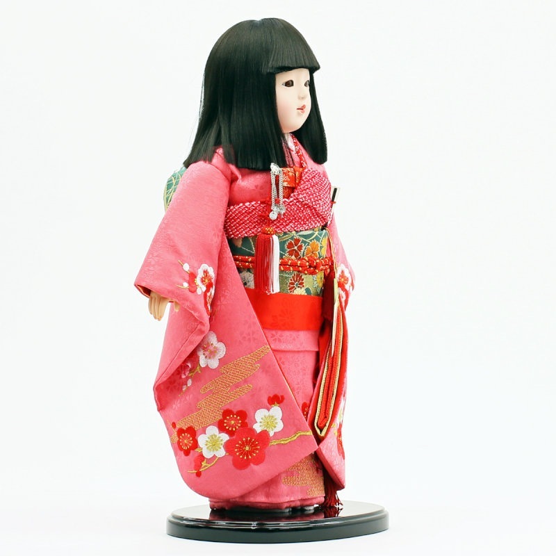 紅白梅柄の刺繍がほどこされた、“正絹”の上質衣装をまとった市松人形です。
