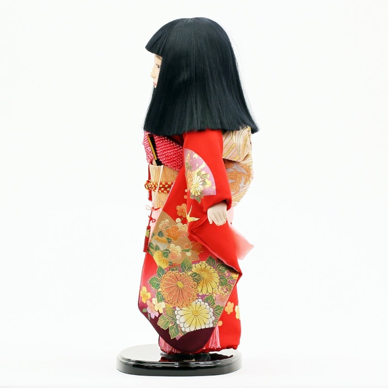 赤地に高級感を印象づける柄を合わせた、“正絹”の上質衣装をまとった市松人形です。