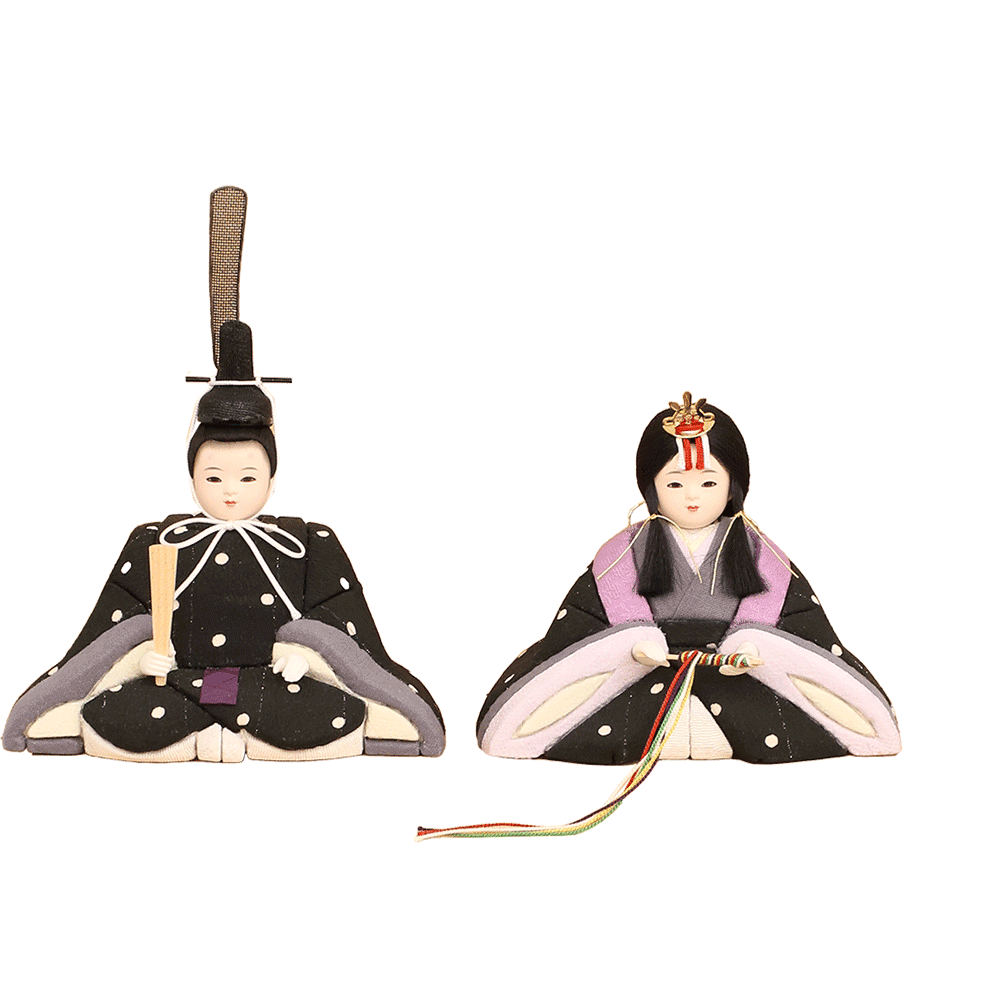 黒に白の水玉柄のお衣裳やつるし飾りとマッチした、かわいいお顔のお雛様。