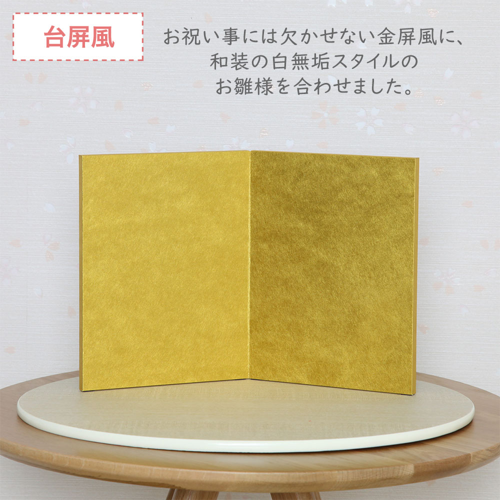 お祝い事には欠かせない金屏風に、和装の白無垢スタイルのお雛様を合わせました。