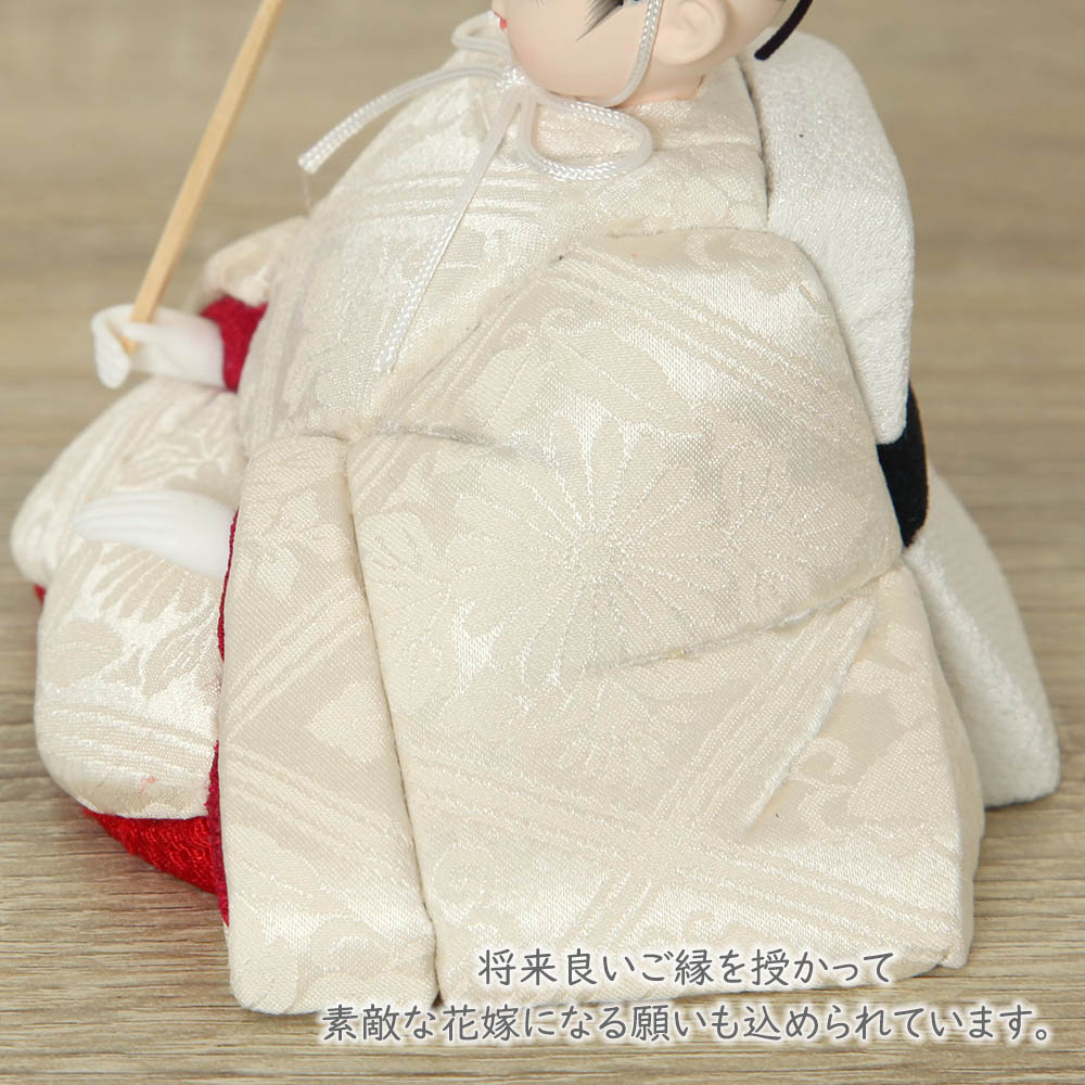 丸いお顔のお雛様は、木目込み雛人形では珍しい大垂髪(おすべらかし)の髪型です。ふっくらしたボディに親しみ深い表情で、見る人の心を和ませます。