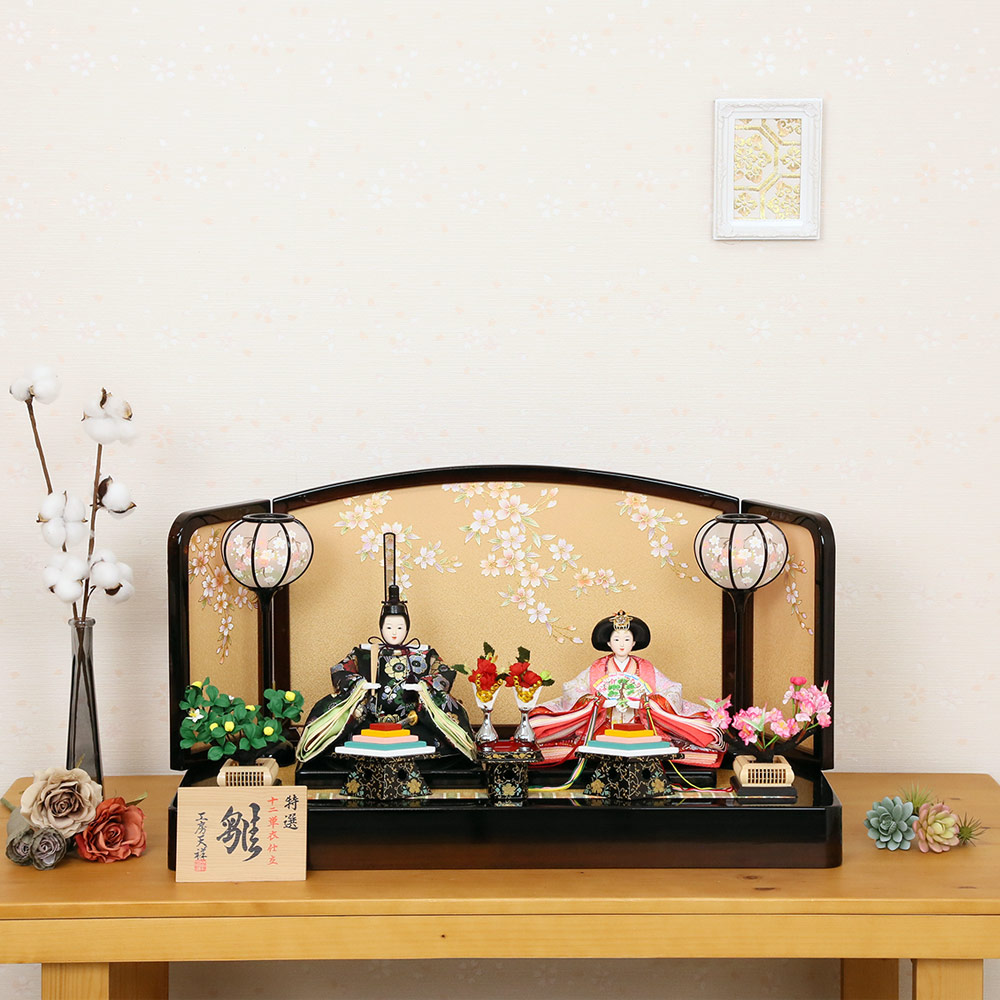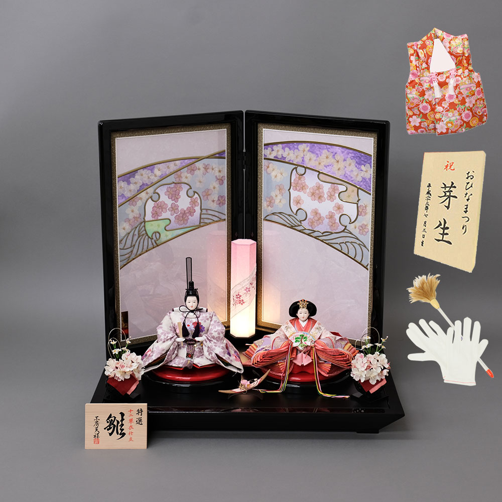 “正絹”生地で作られた桜モチーフが付いた和紙屏風の艶やかさが、お着物にもマッチして、エレガントな印象の親王飾りに仕上がっています。【B】n23uw-k20pr-cc5