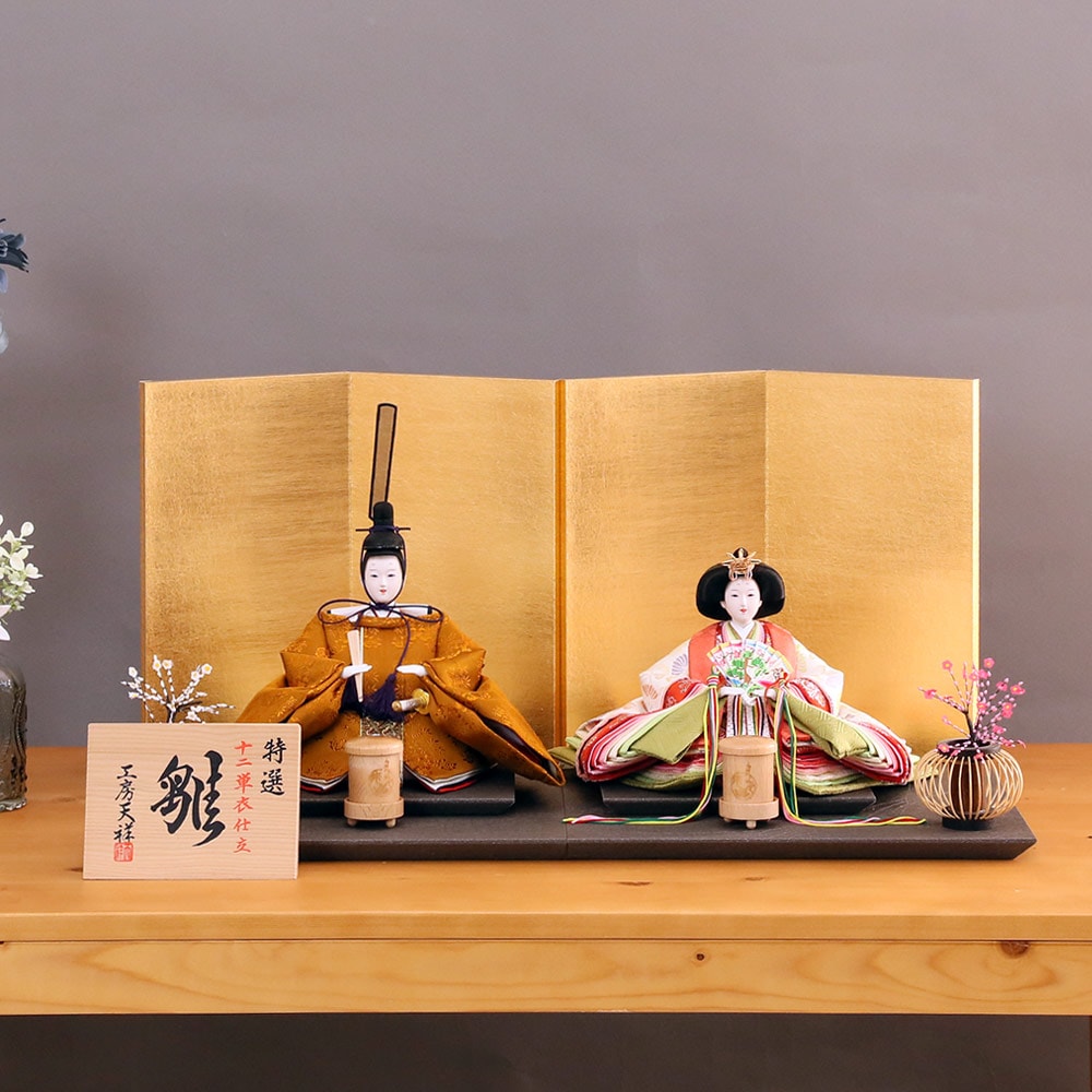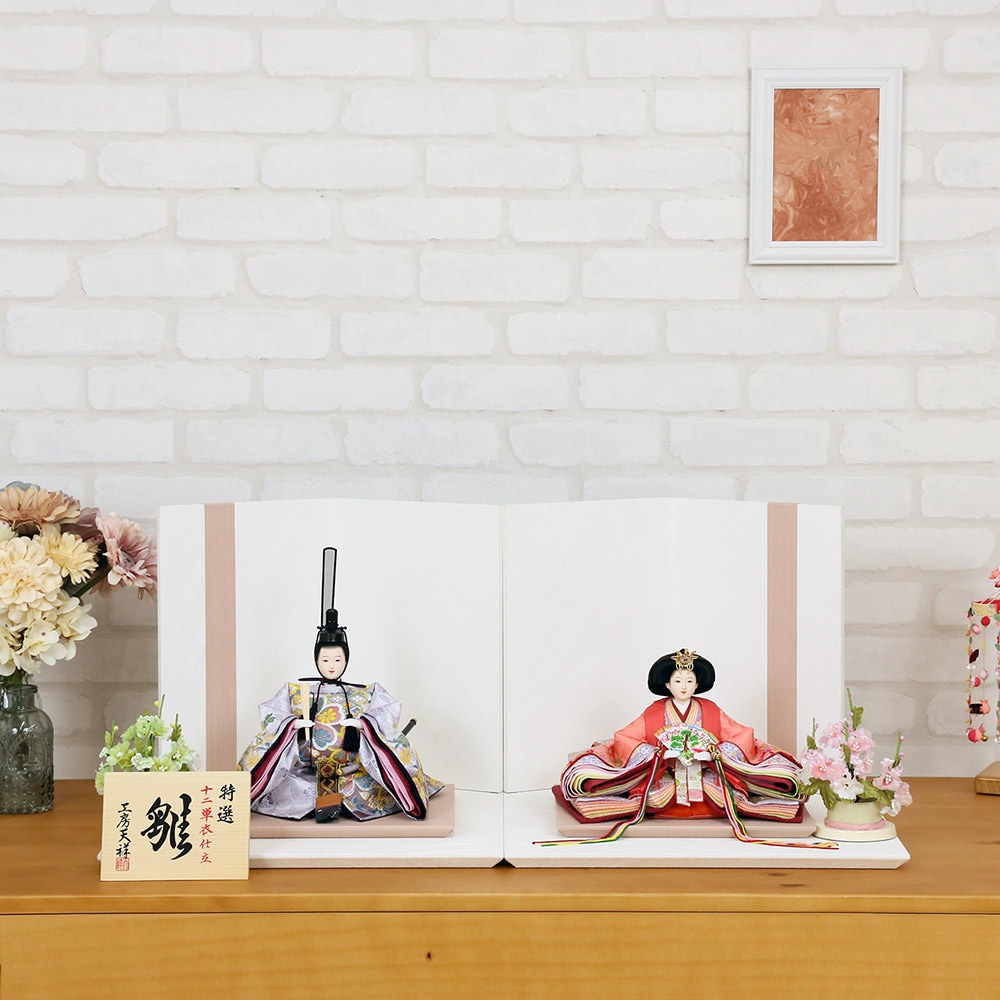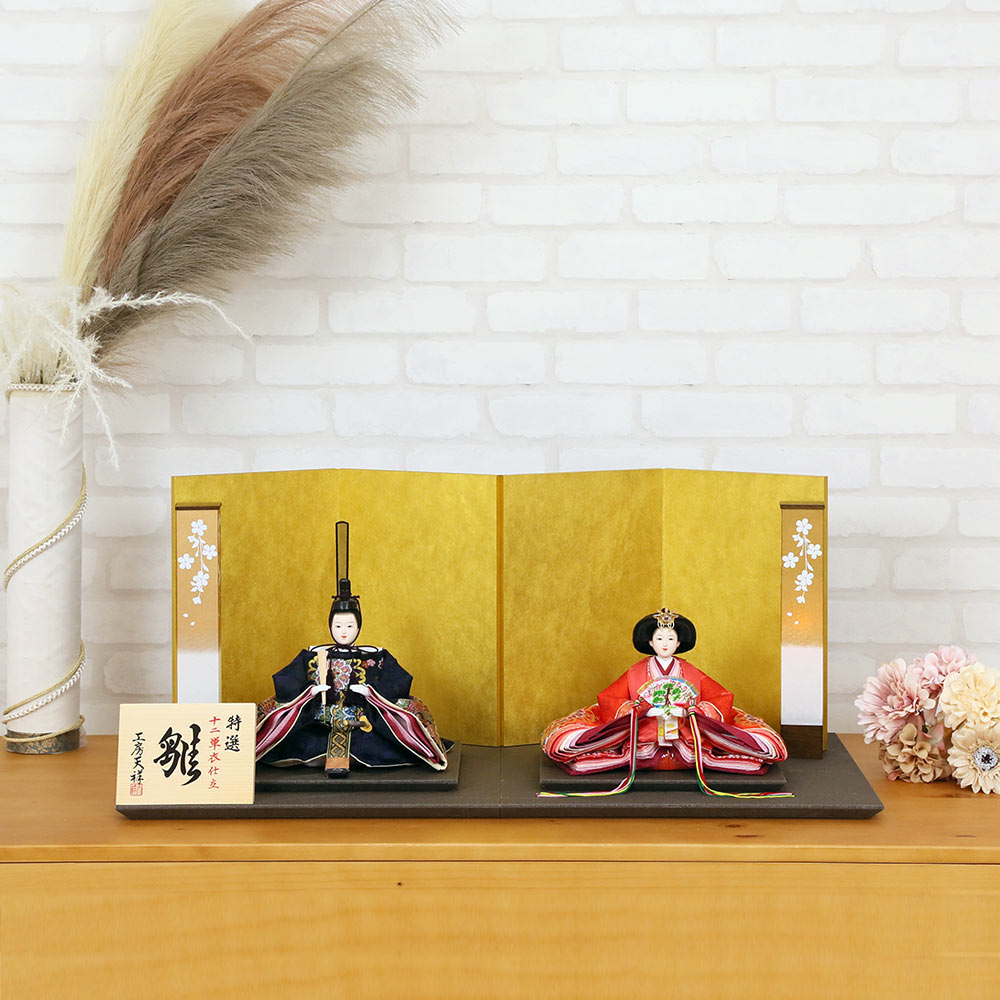 優美な雰囲気を放つ和紙二曲屏風によって、内裏雛の艶やかさがより際立つ雛人形です。