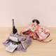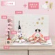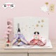 男雛には藤色、女雛には白やピンク色を基調とし古典的花文様柄を織り出した、ここ数年人気の色合わせのお雛様です。ピンク色がポイントの屏風は、パステルカラーのお着物にもマッチして、エレガントな印象の親王飾りです。
