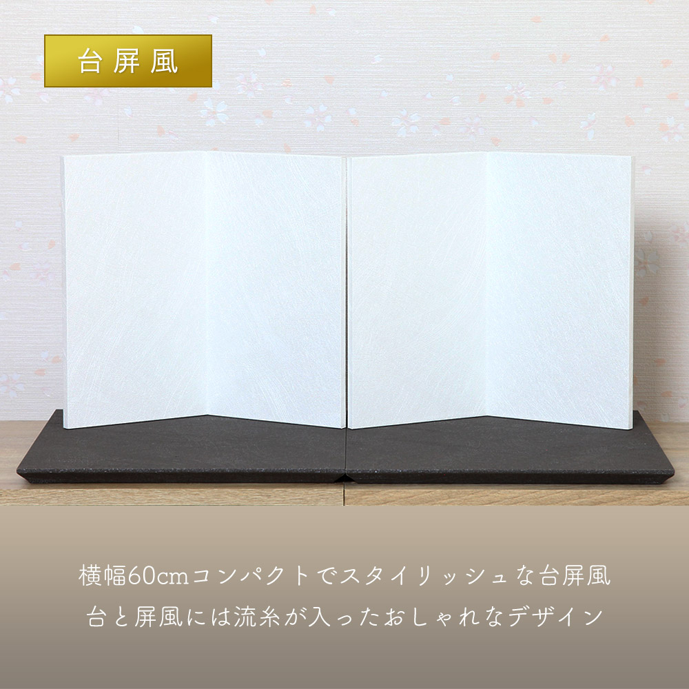 横幅60cmはコンパクトに飾れて、台と屏風には流糸が入ったおしゃれなデザインで、シンプルな飾り方でも、見栄えは損なわない丁度良いサイズ感です。