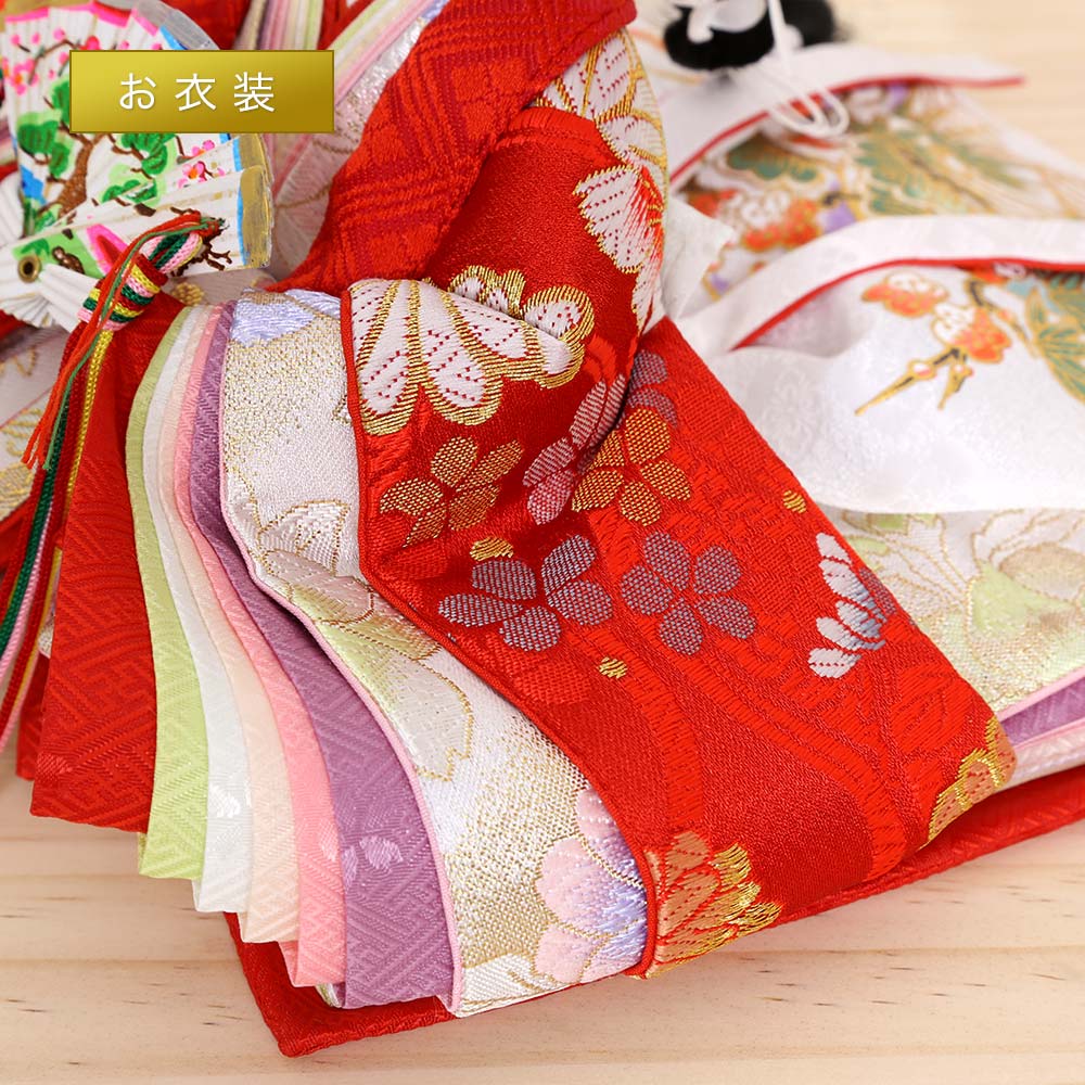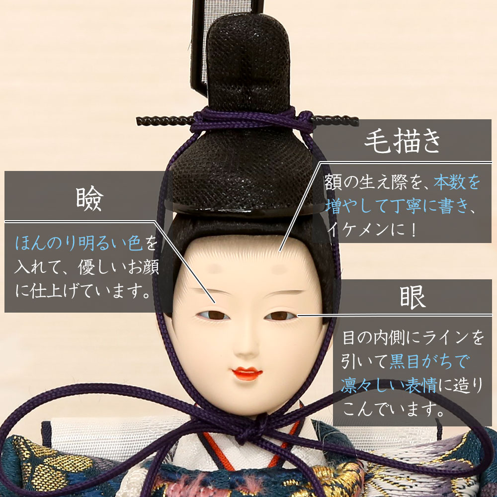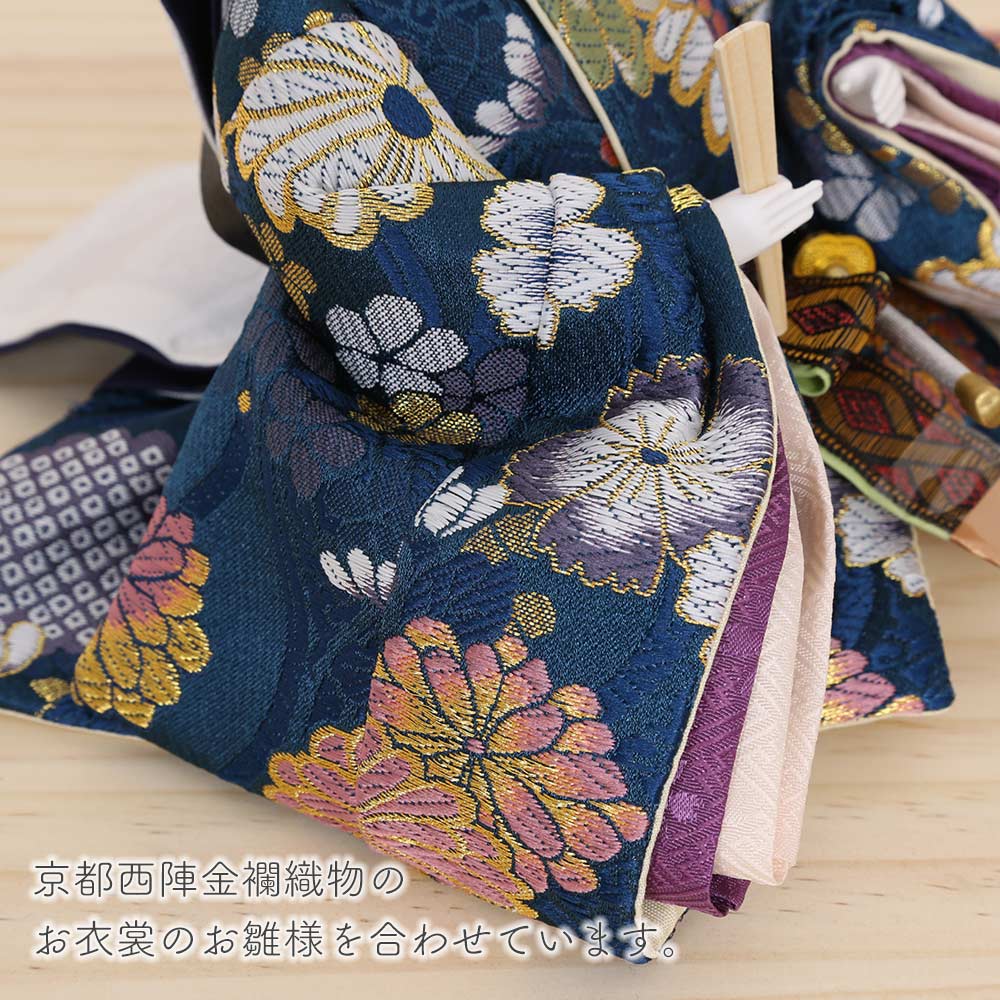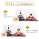 男雛には紺色、そして女雛には赤を基調とし桜文様柄織り出したお衣裳は、昔ながらの伝統的なスタイルのお雛様です。