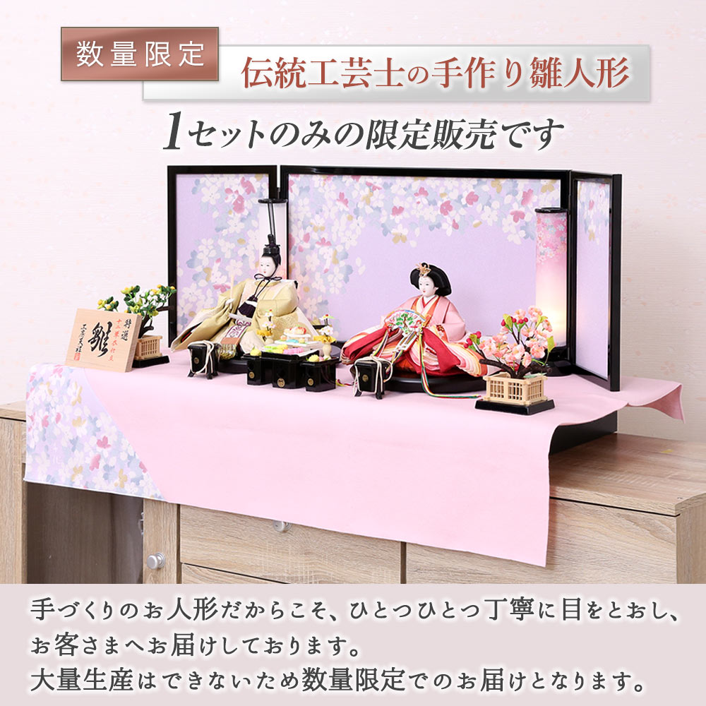 ピンク色の毛せんと、桜が描かれた藤色屏風が、お着物の風合いと相まって、華やかな親王飾り雛人形に仕上がっています。