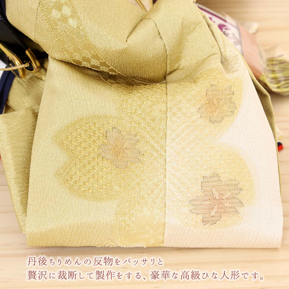 従来の雛人形と違って、こちらの「めぐし雛シリーズ」のお雛様は、丹後ちりめんの反物をバッサリと贅沢に裁断して製作をする、豪華な高級ひな人形です。