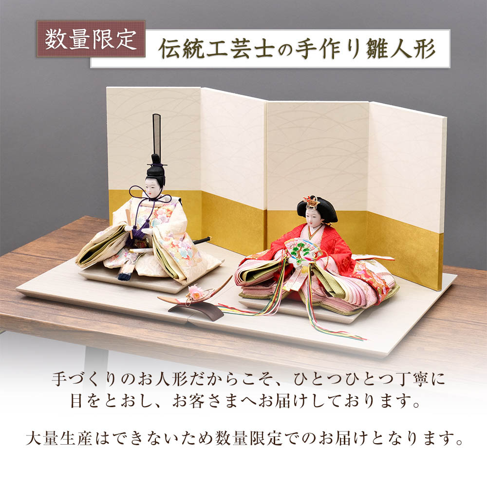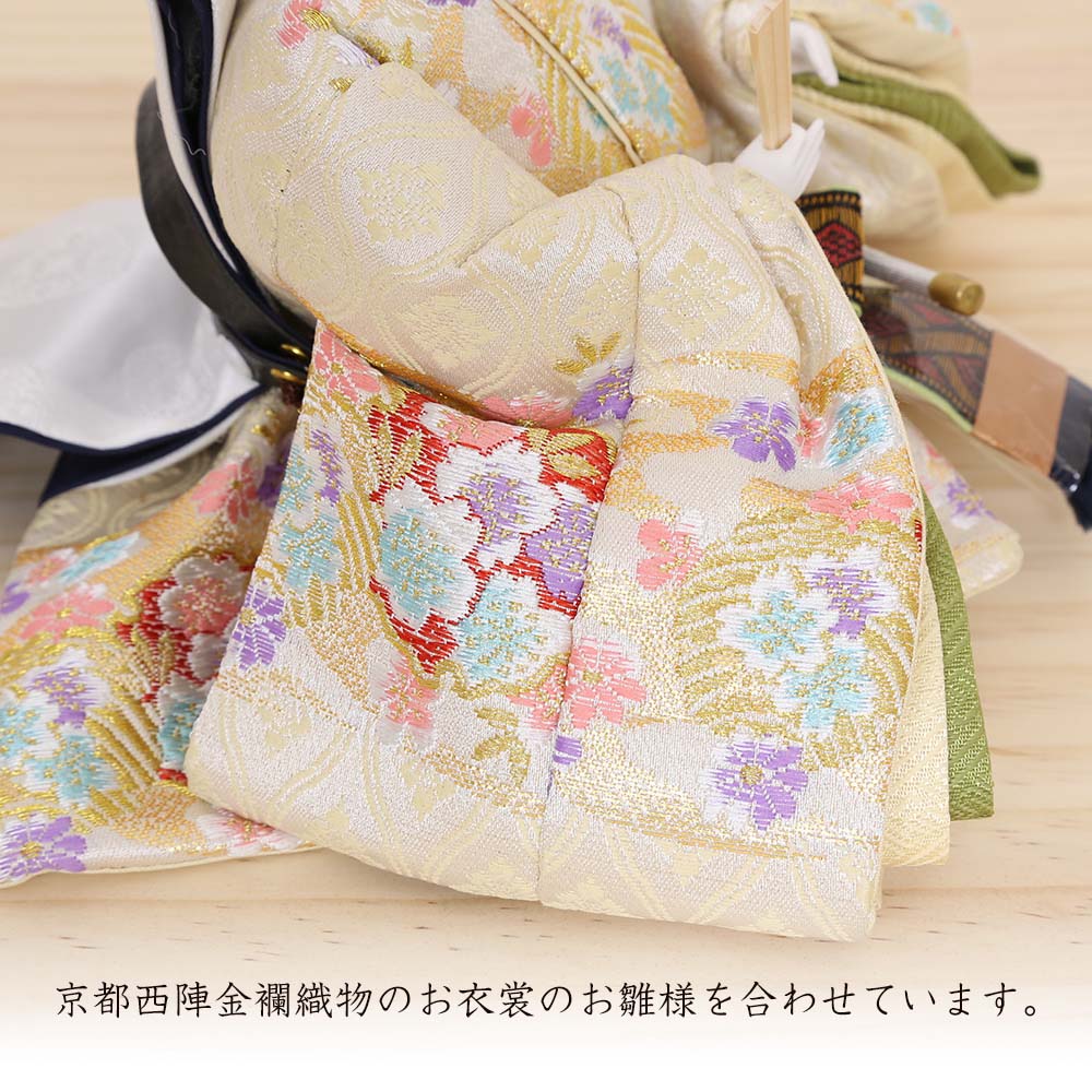 つゆ芝金彩屏風によって、お着物の上質感を、より高級感ある印象の親王飾りに仕上げています。