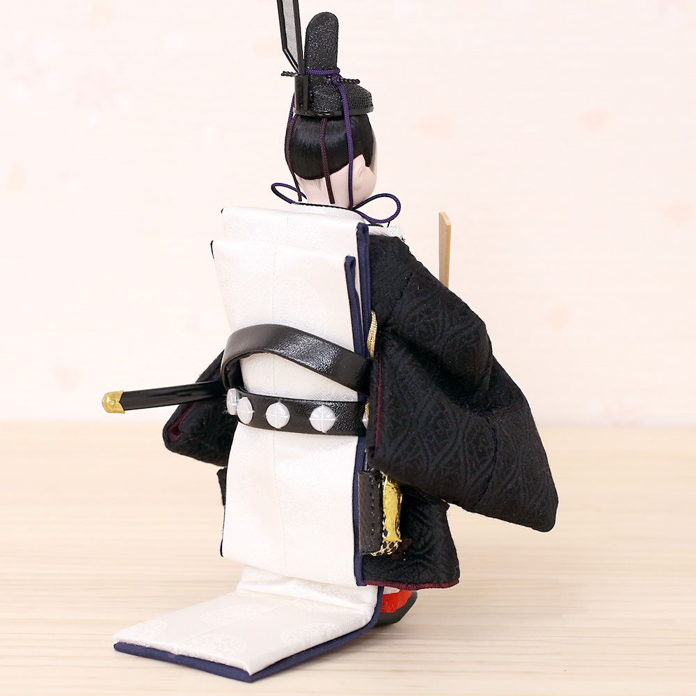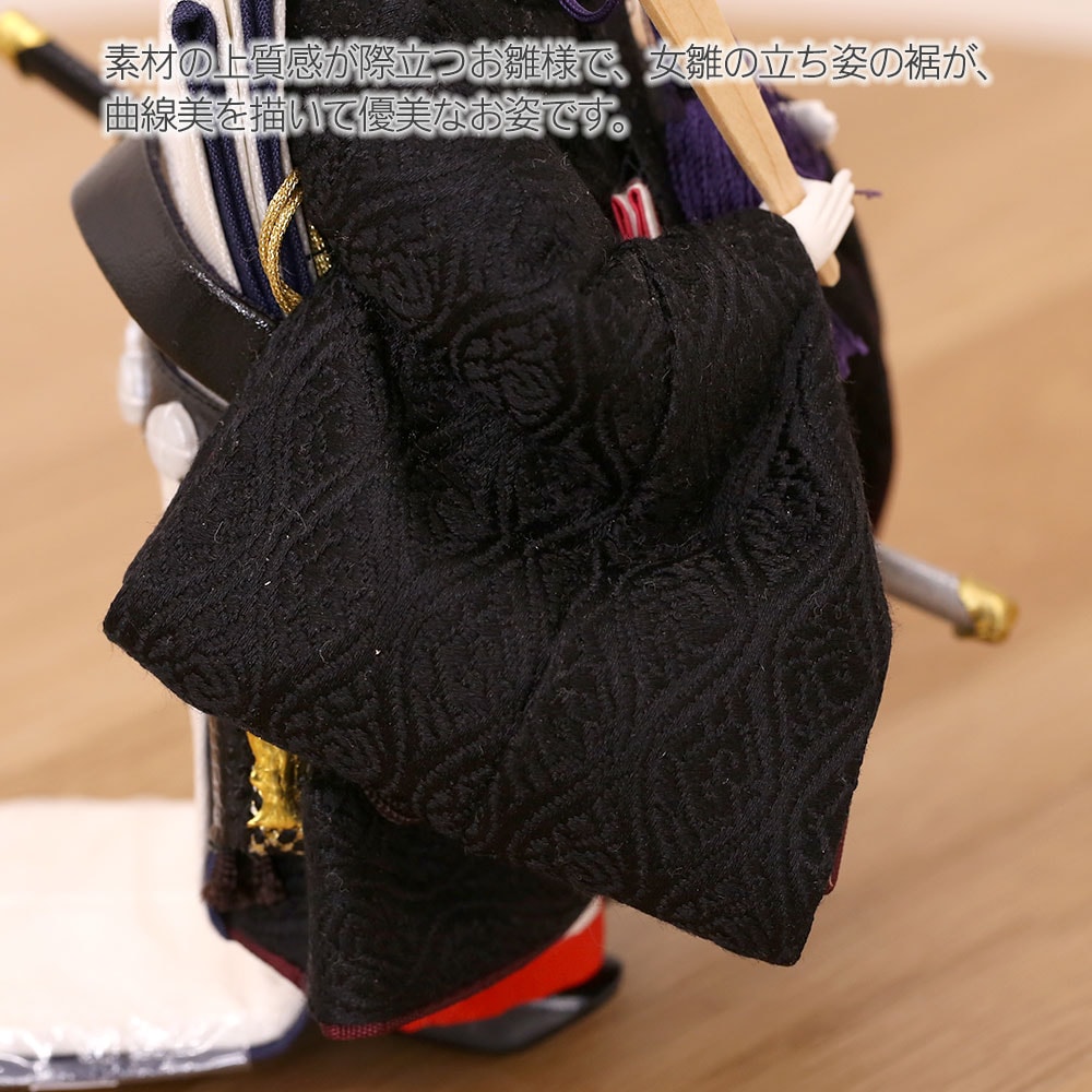 正絹生地で作られたお衣裳は、素材の上質感が際立つお雛様で、女雛の立ち姿の裾が、曲線美を描いて優美なお姿です。