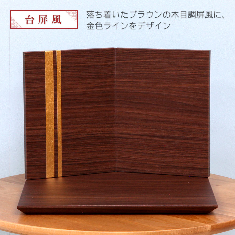 落ち着いたブラウンの木目調屏風に、金色ラインをデザインして、現代のお部屋やマンションの洋室にも、コンパクトに飾って頂ける雛人形 親王飾りです。 間口(横幅)30×奥行28×高さ23(cm) 雛人形は元々、皇室を模写したお姿が起源といわれています。 こちらのお雛様は、天皇陛下が儀式の際にお召しになられる、黄櫨染という装束をご着用されています。
