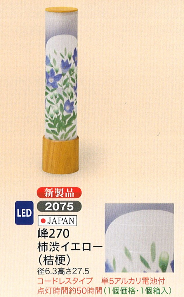 【家紋・お名前入れは8/165以降順次発送となります。】 化学物質を含まない優れた天然塗料「柿渋」塗り製品。■天然素材で人体に優しく、従来の柿渋特有のニオイが少ない■木材と相性が良く表情に深みを与え、木製品の魅力を高める■防腐・防カビ・防虫・消臭・防水・補強などの効能により木製品の寿命を延ばし、経年による色変化がない■石油由来の溶剤は一切不必要、水と原料にこだわった国内ハンドメイドで製造される安心の品質◆商品詳細サイズ 径6.3×高さ27.5cm生産地 日本仕 様 コードレスタイプ単5アルカリ電池付点灯時間約50時間1個価格・1個箱入※こちらの商品は配送までに7営業日お時間を頂いておりますのでご了承下さい。