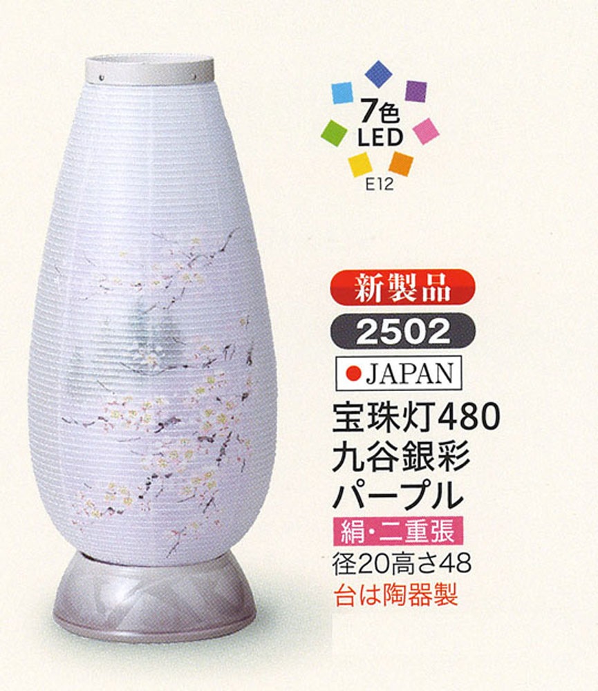 【家紋・お名前入れは8/371以降順次発送となります。】 【宝珠灯シリーズ】仏具セット「やわらぎ」「さやか」とのコラボレーション提灯です。宝珠灯の下台は、自社生産の陶器製です。下台と同色の仏具セットがございます。LEDレインボー球により、廻転イメージを再現しました。「宝珠灯」には、LEDレインボー球(小)が付属しております。◆商品詳細サイズ 径20×高さ48cm素材[火袋]絹・二重張 [下台]陶器生産地 日本仕 様 [電球]7色LED※こちらの商品は配送までに7営業日お時間を頂いておりますのでご了承下さい。