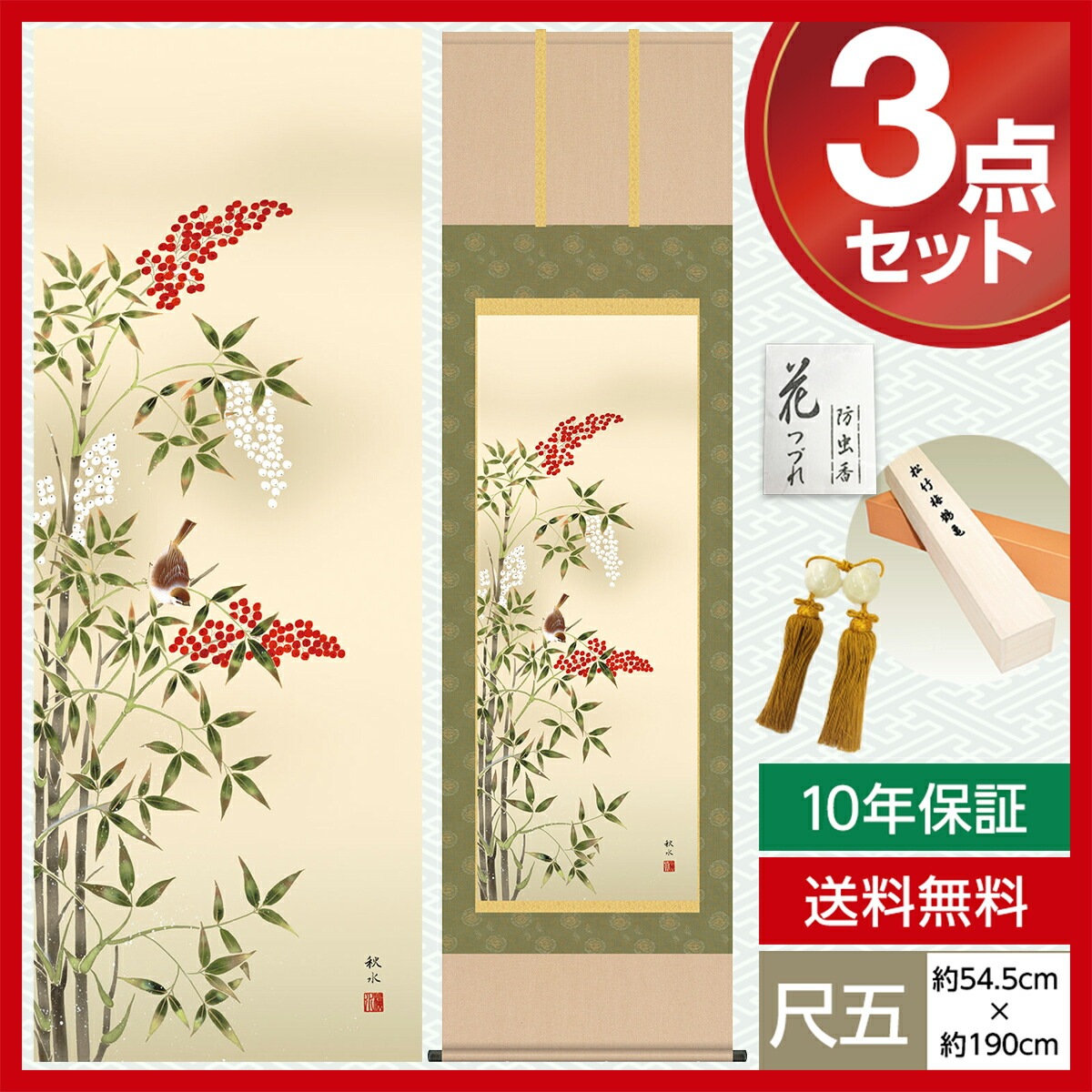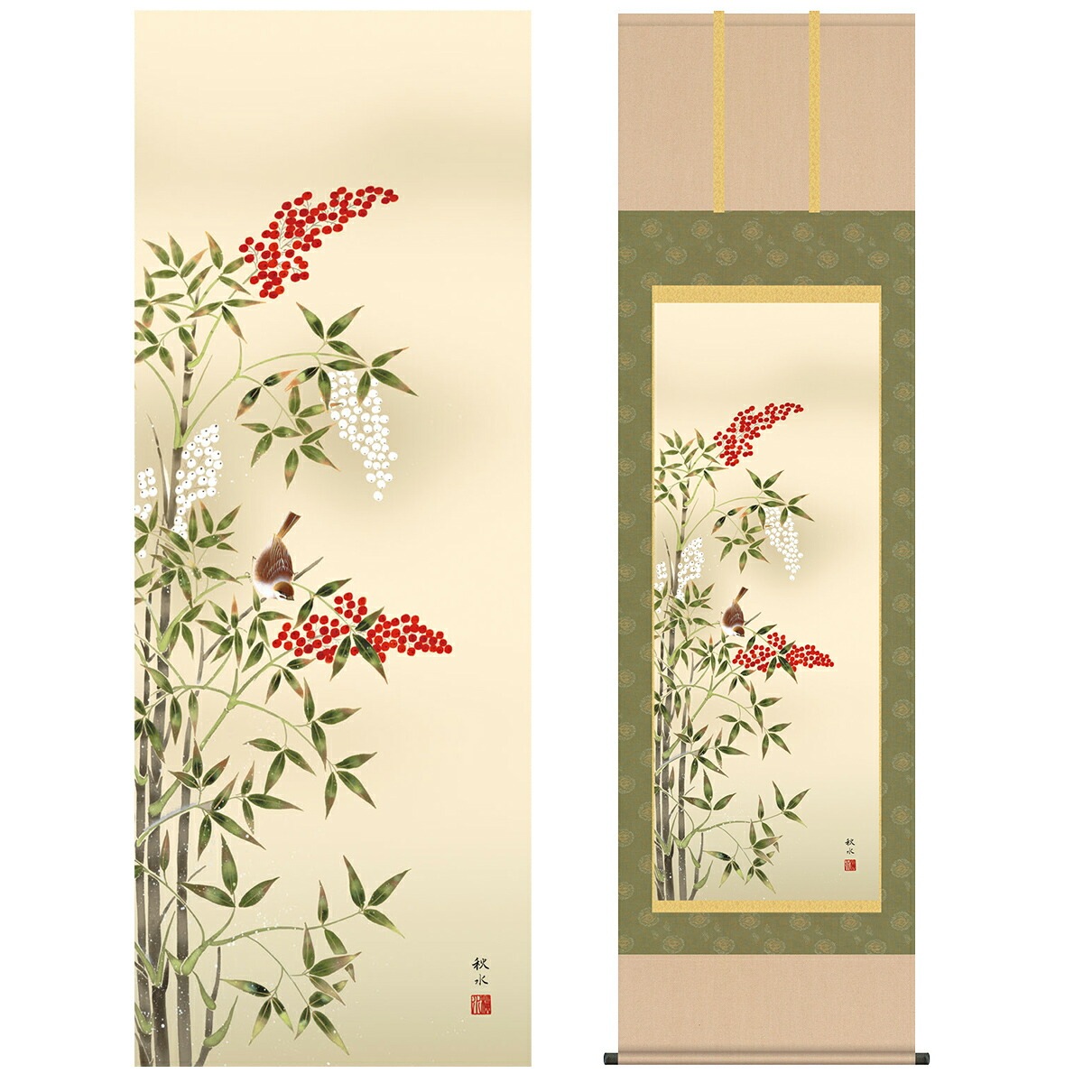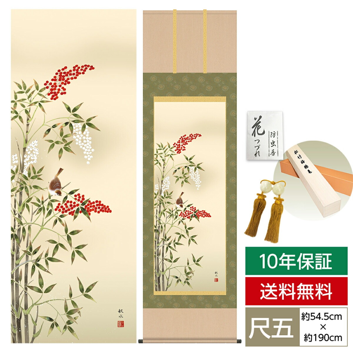 掛け軸 床の間 モダン 和風 尺五 花鳥掛軸 冬掛 南天に雀 浮田 秋水 草夕会 約54.5cm 190cm 洛彩緞子本表装 筋廻仕様 10年間保証 収納箱 防虫香 風鎮 付き 1/15以降順次発送