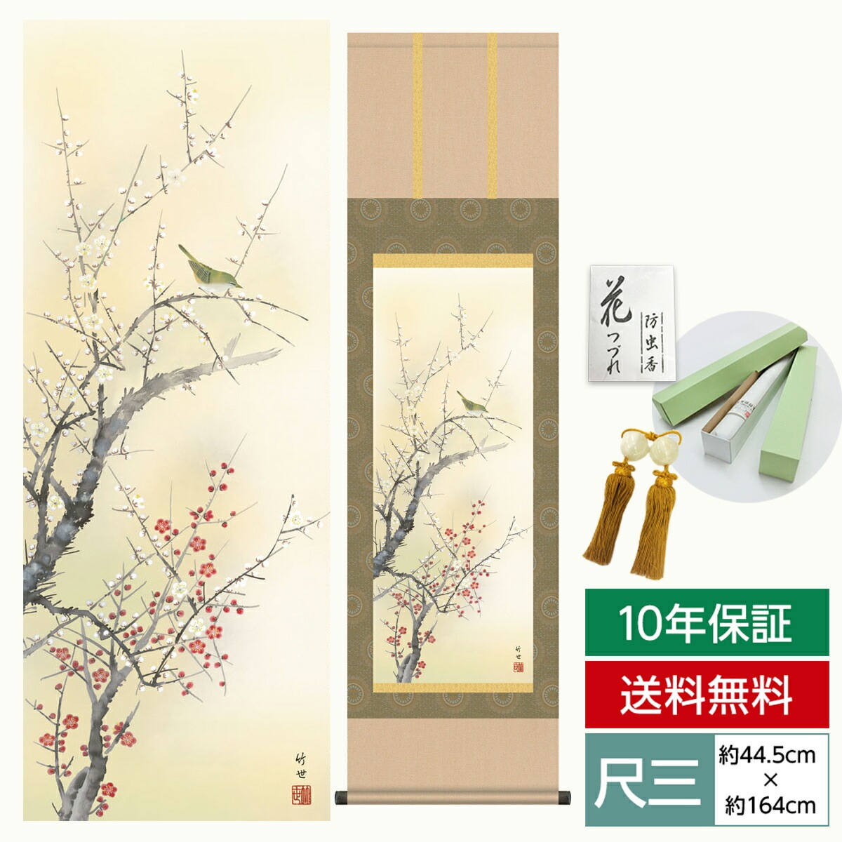 掛け軸 床の間 モダン 和風 尺三 花鳥掛軸 春掛 紅白梅に鶯 田村 竹世 三美会 約44.5 164cm 洛彩緞子本表装 10年間保証 収納箱 防虫香 風鎮 付き 1/15以降順次発送