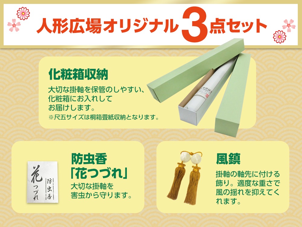 この製品には10年間品質保証がついておりますが、お客様の責任による破損・歪み等は補償の対象外になります。例えば、掛軸を落とした、掛軸を湿度の高い場所での保管など。また商品の性質上、仕上がりに個体差が生じますのであらかじめご了承ください。