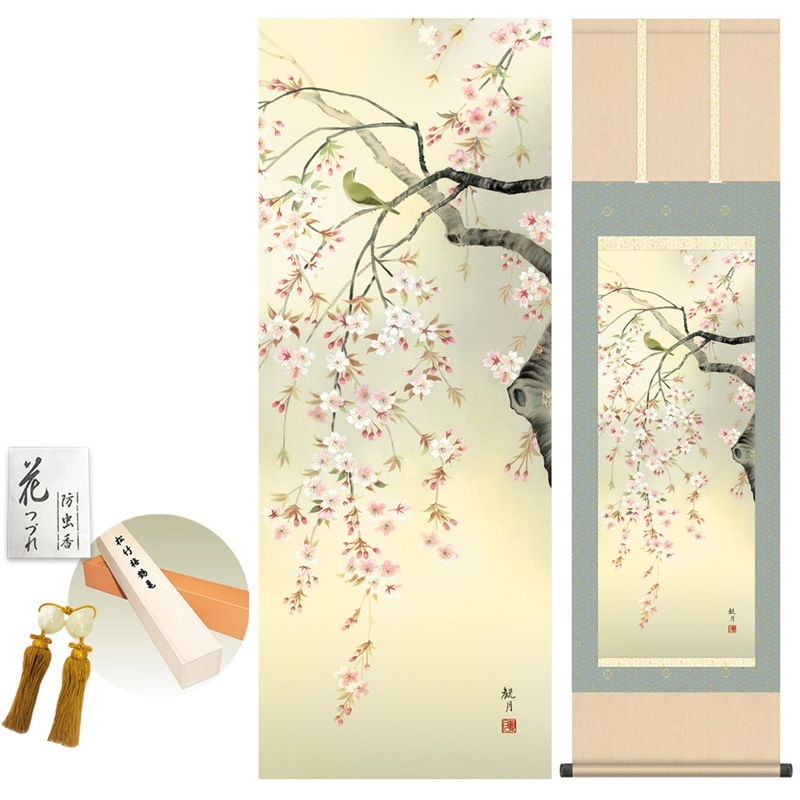 商品名 掛け軸 モダン 桜花 森山観月 洛彩緞子本表装 幅44.5×高さ約164cm 新絹本 表装品質10年間保証 掛け軸 モダン 収納箱 防虫香 風鎮 付き モダン おしゃれ かわいい