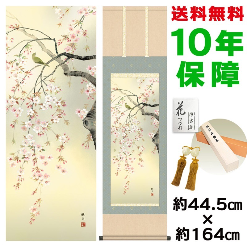 掛け軸 床の間 モダン 和風 桜花 森山観月 洛彩緞子本表装 約44.5 164cm 新絹本 10年間保証 収納箱 防虫香 風鎮 付き 1/15以降順次発送