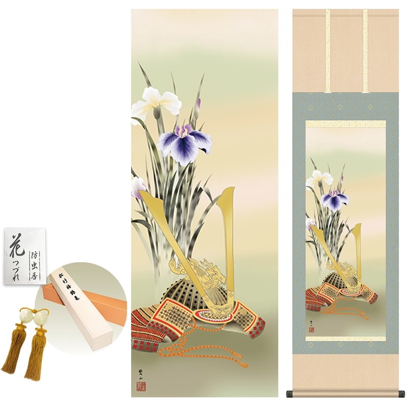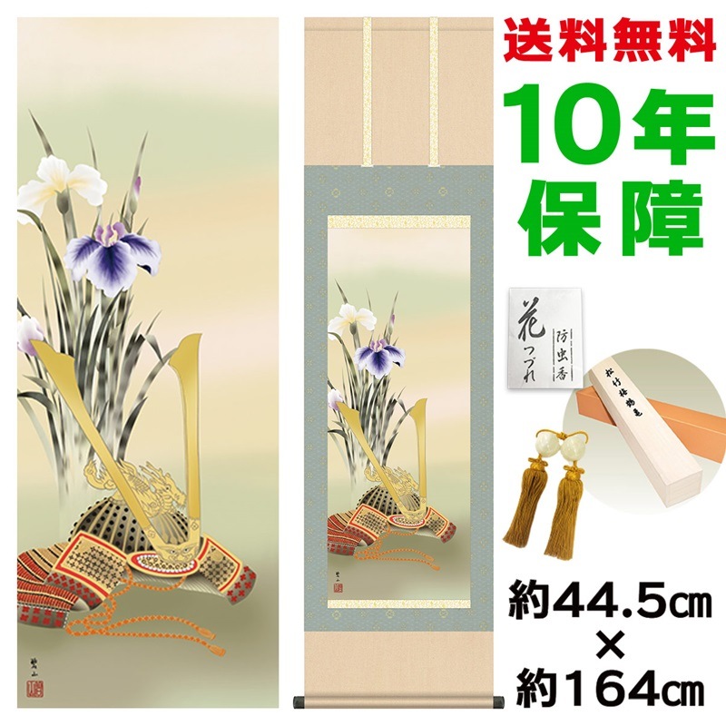 商品名 掛け軸 モダン 兜と菖蒲 唐沢碧山 洛彩緞子本表装 幅44.5×高さ約164cm 新絹本 表装品質10年間保証 掛け軸 モダン 収納箱 防虫香 風鎮 付き モダン おしゃれ かわいい