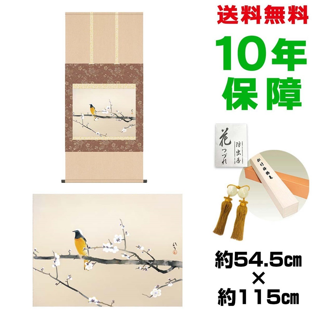 掛け軸 床の間 モダン 和風 尺五 梅花小禽図 川端龍子 洛彩緞子本表装 約54.5 115cm 新絹本 10年間保証 収納箱 防虫香 風鎮 付き 複製画 1/15以降順次発送