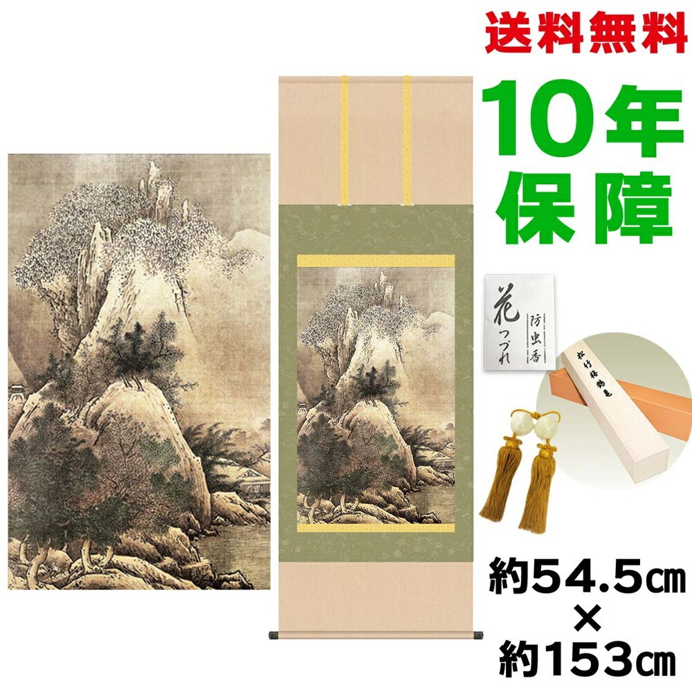 掛け軸 床の間 モダン 和風 尺五 四季山水図 冬 雪舟 洛彩緞子本表装 約54.5 153cm 新絹本 10年間保証 収納箱 防虫香 風鎮 付き 複製画 1/15以降順次発送