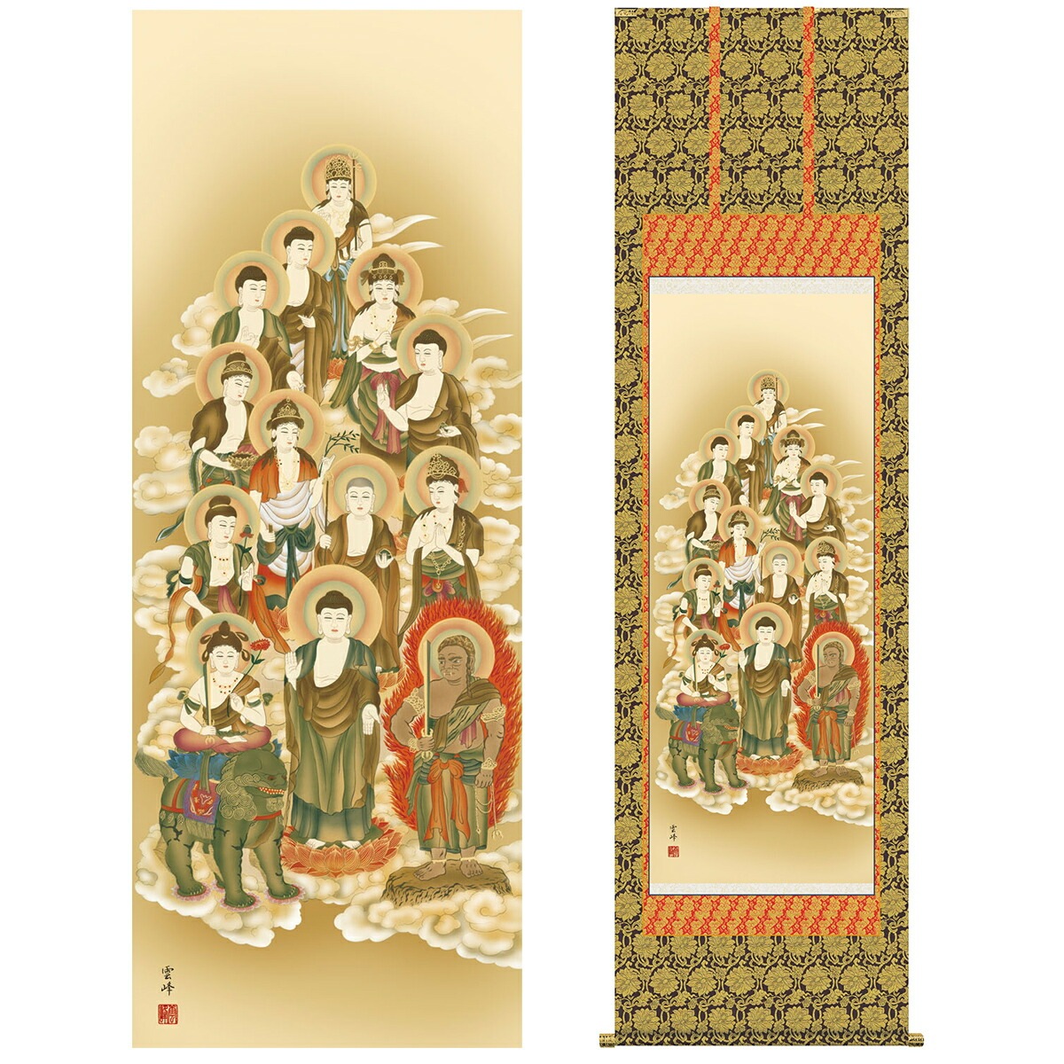 掛け軸 床の間 モダン 和風 仏事掛軸 尺五 十三佛 清水 雲峰 三美会 約54.5cm 190cm 金襴本佛表装 10年間保証 収納箱 防虫香 風鎮 付き 1/15以降順次発送