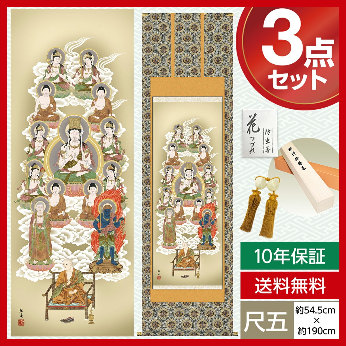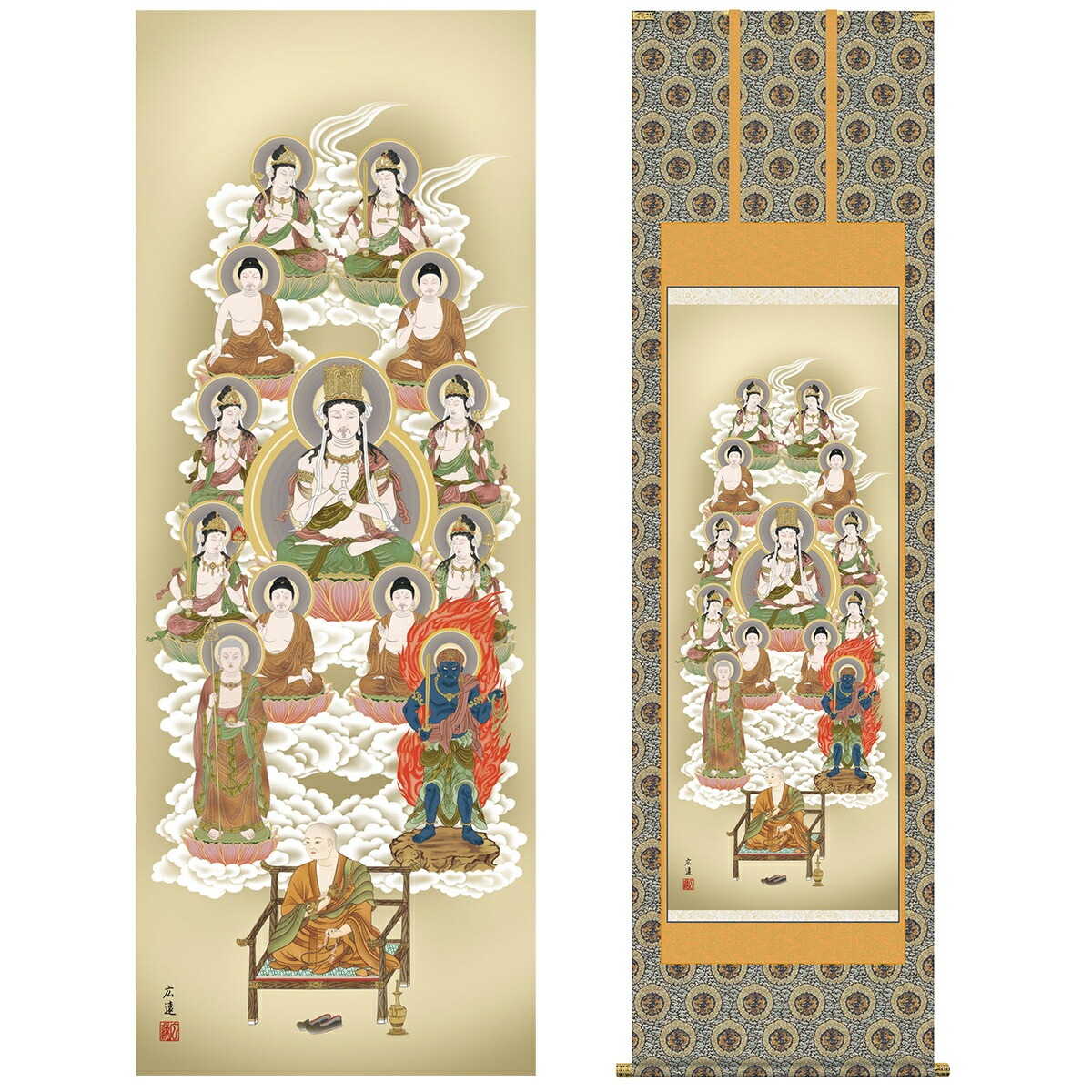 掛け軸 床の間 モダン 和風 仏事掛軸 尺五 真言十三佛 田中 広遠 白翠会 約54.5cm 190cm 金襴本佛表装 10年間保証 収納箱 防虫香 風鎮 付き 1/15以降順次発送